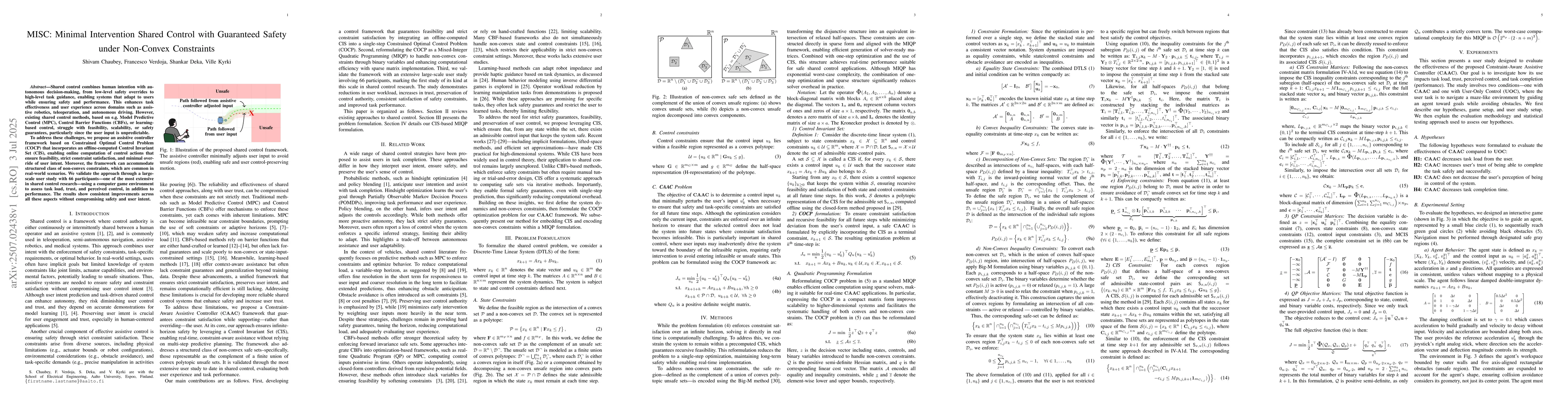 Shared control combines human intention with autonomous decision-making, from low-level safety overrides to high-level task guidance, enabling systems that adapt to users while ensuring safety and performance. This enhances task effectiveness and user experience across domains such as assistive robotics, teleoperation, and autonomous driving. However, existing shared control methods, based on e.g. Model Predictive Control, Control Barrier Functions, or learning-based control, struggle with feasibility, scalability, or safety guarantees, particularly since the user input is unpredictable. To address these challenges, we propose an assistive controller framework based on Constrained Optimal Control Problem that incorporates an offline-computed Control Invariant Set, enabling online computation of control actions that ensure feasibility, strict constraint satisfaction, and minimal override of user intent. Moreover, the framework can accommodate structured class of non-convex constraints, which are common in real-world scenarios. We validate the approach through a large-scale user study with 66 participants--one of the most extensive in shared control research--using a computer game environment to assess task load, trust, and perceived control, in addition to performance. The results show consistent improvements across all these aspects without compromising safety and user intent.