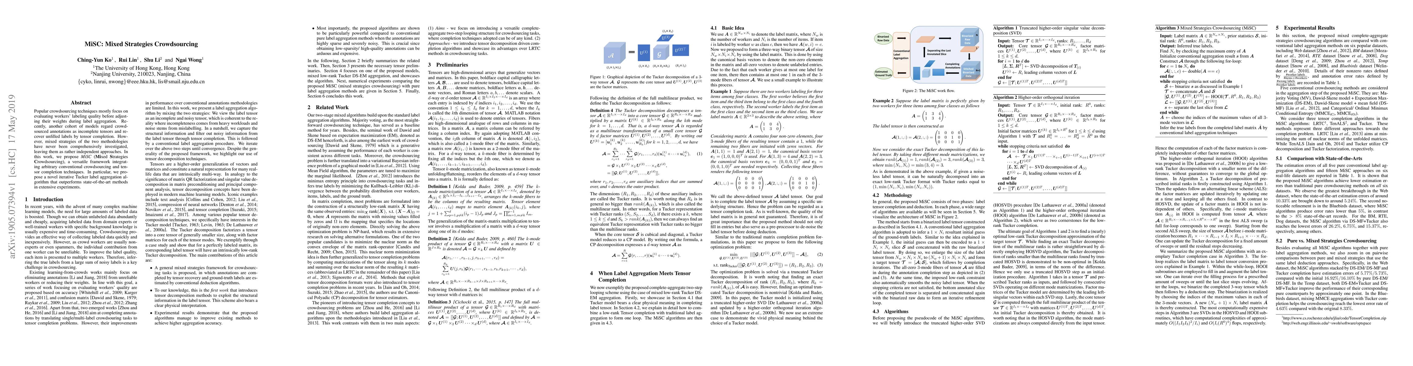 Popular crowdsourcing techniques mostly focus on evaluating workers' labeling quality before adjusting their weights during label aggregation. Recently, another cohort of models regard crowdsourced annotations as incomplete tensors and recover unfilled labels by tensor completion. However, mixed strategies of the two methodologies have never been comprehensively investigated, leaving them as rather independent approaches. In this work, we propose $\textit{MiSC}$ ($\textbf{Mi}$xed $\textbf{S}$trategies $\textbf{C}$rowdsourcing), a versatile framework integrating arbitrary conventional crowdsourcing and tensor completion techniques. In particular, we propose a novel iterative Tucker label aggregation algorithm that outperforms state-of-the-art methods in extensive experiments.