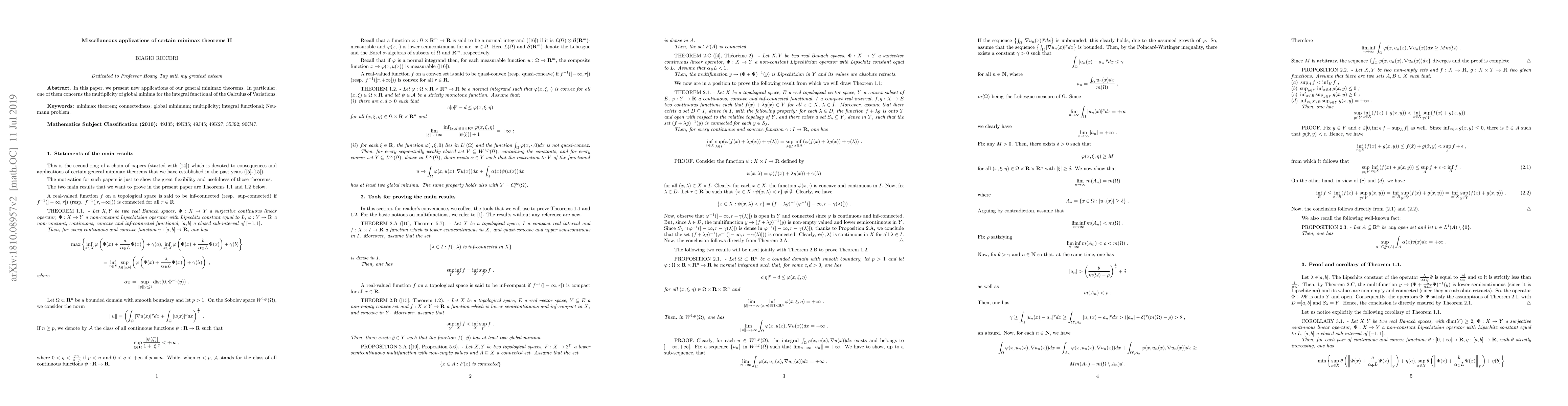 In this paper, we present new applications of our general minimax theorems. In particular, one of them concerns the multiplicity of global minima for the integral functional of the Calculus of Variations.