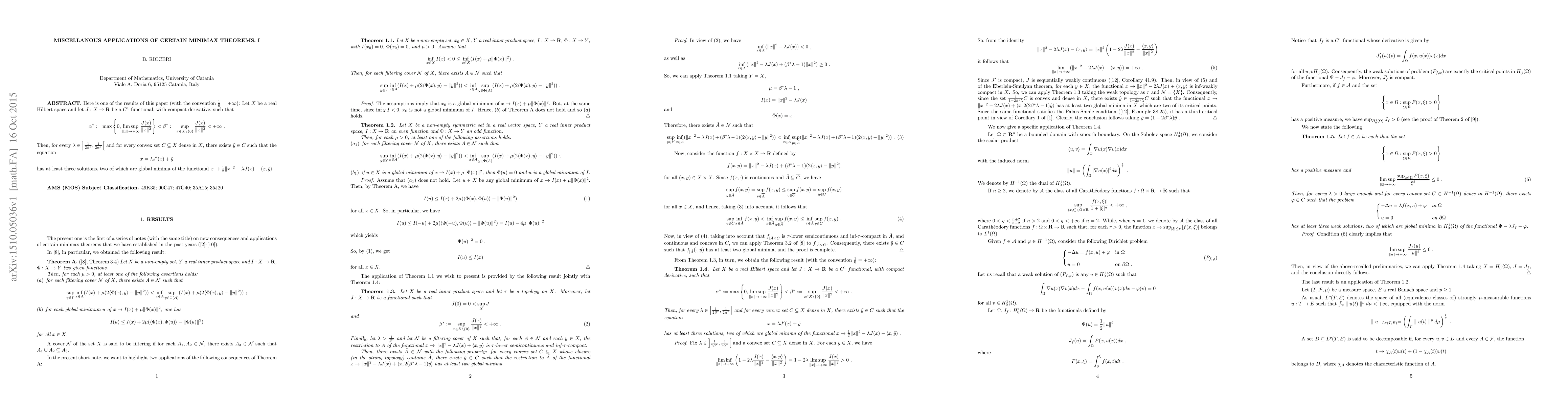 Here is one of the results of this paper (with the convention ${{1}\over {0}}=+\infty$): Let $X$ be a real Hilbert space and let $J:X\to {\bf R}$ be a $C^1$ functional, with compact derivative, such that $$\alpha^*:=\max\left \{0,\limsup_{\|x\|\to +\infty}{{J(x)}\over {\|x\|^2}}\right \}<\beta^*:=\sup_{x\in X\setminus \{0\}}{{J(x)}\over {\|x\|^2}}<+\infty\ .$$ Then, for every $\lambda\in \left ]{{1}\over {2\beta^*}}, {{1}\over {2\alpha^*}}\right [$ and for every convex set $C\subseteq X$ dense in $X$, there exists $\tilde y\in C$ such that the equation $$x=\lambda J'(x)+\tilde y$$ has at least three solutions, two of which are global minima of the functional $x\to {{1}\over {2}}\|x\|^2-\lambda J(x)-\langle x,\tilde y\rangle$ .