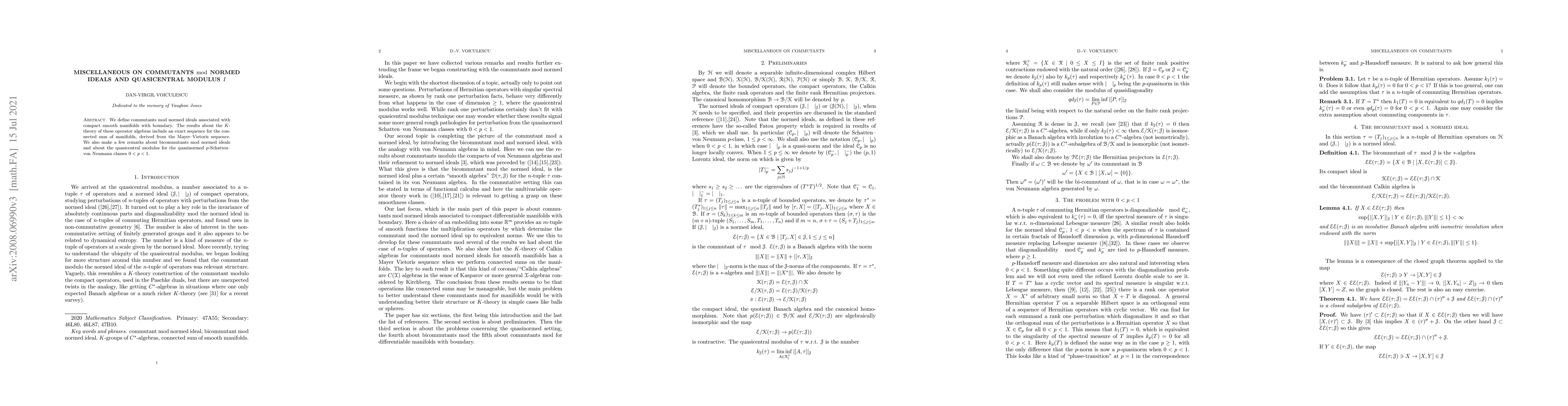 This paper introduces the concept of commutants modulo normed ideals in the context of operator algebras on compact smooth manifolds with boundary, establishing an exact sequence for manifold connected sums derived from the Mayer-Vietoris sequence and touching upon bicommutants and quasicentral modulus in quasinormed p-Schatten-von Neumann classes.