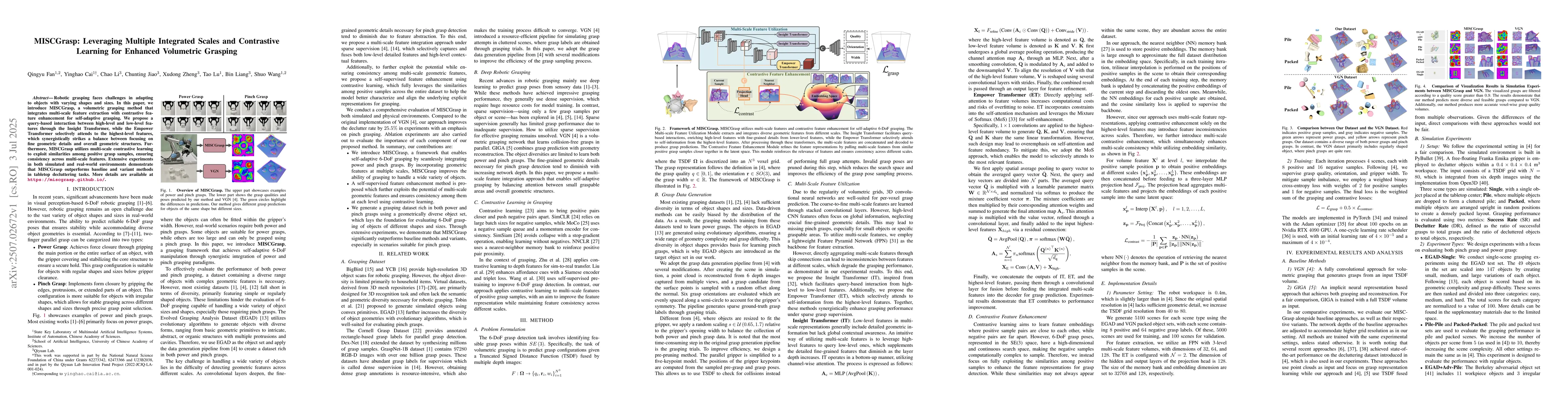 Robotic grasping faces challenges in adapting to objects with varying shapes and sizes. In this paper, we introduce MISCGrasp, a volumetric grasping method that integrates multi-scale feature extraction with contrastive feature enhancement for self-adaptive grasping. We propose a query-based interaction between high-level and low-level features through the Insight Transformer, while the Empower Transformer selectively attends to the highest-level features, which synergistically strikes a balance between focusing on fine geometric details and overall geometric structures. Furthermore, MISCGrasp utilizes multi-scale contrastive learning to exploit similarities among positive grasp samples, ensuring consistency across multi-scale features. Extensive experiments in both simulated and real-world environments demonstrate that MISCGrasp outperforms baseline and variant methods in tabletop decluttering tasks. More details are available at https://miscgrasp.github.io/.