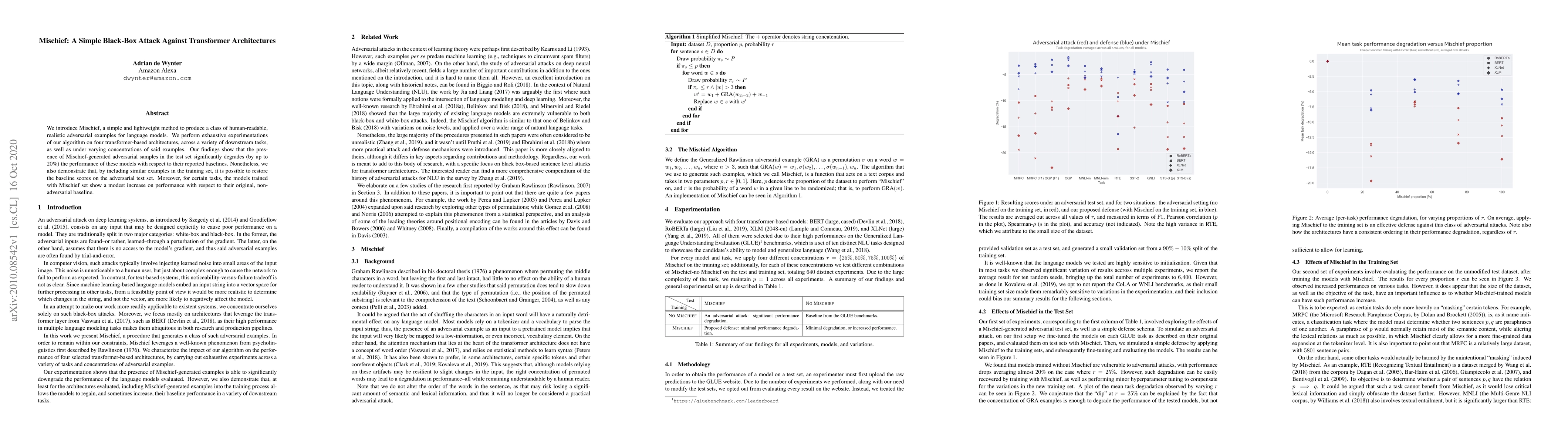 We introduce Mischief, a simple and lightweight method to produce a class of human-readable, realistic adversarial examples for language models. We perform exhaustive experimentations of our algorithm on four transformer-based architectures, across a variety of downstream tasks, as well as under varying concentrations of said examples. Our findings show that the presence of Mischief-generated adversarial samples in the test set significantly degrades (by up to $20\%$) the performance of these models with respect to their reported baselines. Nonetheless, we also demonstrate that, by including similar examples in the training set, it is possible to restore the baseline scores on the adversarial test set. Moreover, for certain tasks, the models trained with Mischief set show a modest increase on performance with respect to their original, non-adversarial baseline.
