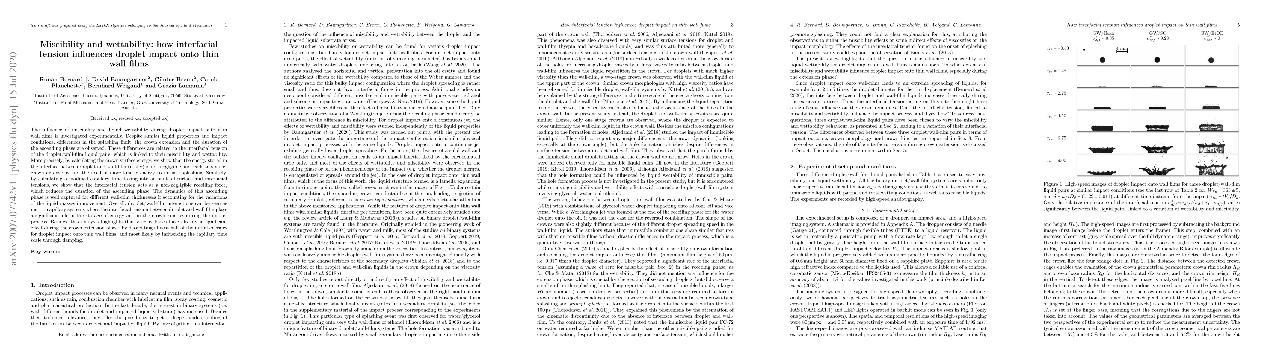 This study experimentally investigates how miscibility and wettability influence droplet impact onto thin wall films, revealing that interfacial tension significantly affects splashing limits, crown extension, and the ascending phase duration. The analysis shows that interfacial tension stores energy and acts as a recoiling force, while viscous losses dissipate almost half of the initial impact energy.