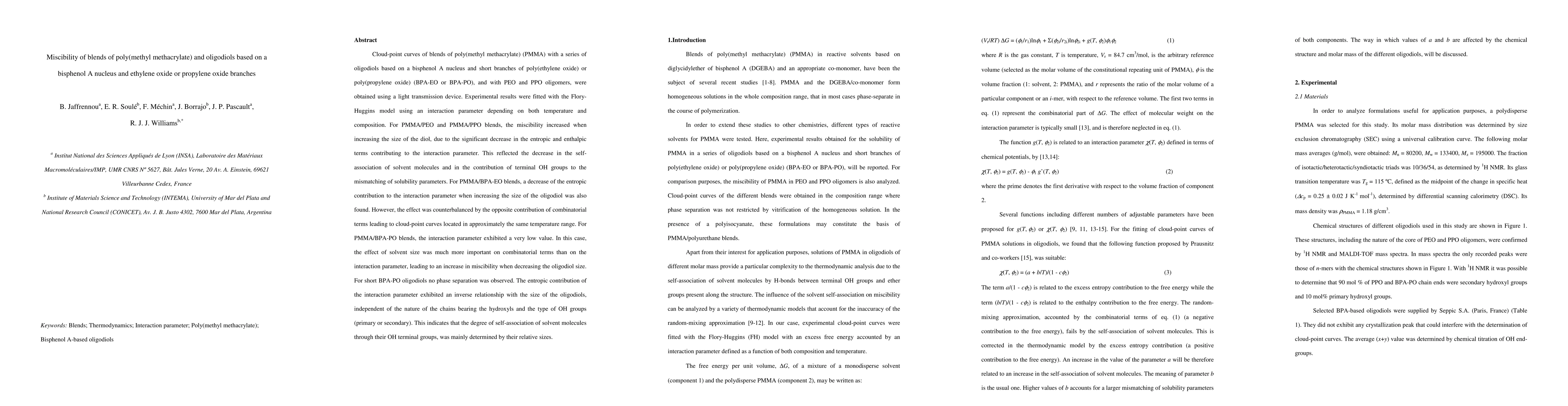 Cloud-point curves of blends of poly(methyl methacrylate) (PMMA) with a series of oligodiols based on a bisphenol A nucleus and short branches of poly(ethylene oxide) or poly(propylene oxide) (BPA-EO or BPA-PO), and with PEO and PPO oligomers, were obtained using a light transmission device. Experimental results were fitted with the Flory- Huggins model using an interaction parameter depending on both temperature and composition. For PMMA/PEO and PMMA/PPO blends, the miscibility increased when increasing the size of the diol, due to the significant decrease in the entropic and enthalpic terms contributing to the interaction parameter. This reflected the decrease in the selfassociation of solvent molecules and in the contribution of terminal OH groups to the mismatching of solubility parameters. For PMMA/BPA-EO blends, a decrease of the entropic contribution to the interaction parameter when increasing the size of the oligodiol was also found. However, the effect was counterbalanced by the opposite contribution of combinatorial terms leading to cloud-point curves located in approximately the same temperature range. For PMMA/BPA-PO blends, the interaction parameter exhibited a very low value. In this case, the effect of solvent size was much more important on combinatorial terms than on the interaction parameter, leading to an increase in miscibility when decreasing the oligodiol size. For short BPA-PO oligodiols no phase separation was observed. The entropic contribution of the interaction parameter exhibited an inverse relationship with the size of the oligodiols, independent of the nature of the chains bearing the hydroxyls and the type of OH groups (primary or secondary). This indicates that the degree of self-association of solvent molecules through their OH terminal groups, was mainly determined by their relative sizes.