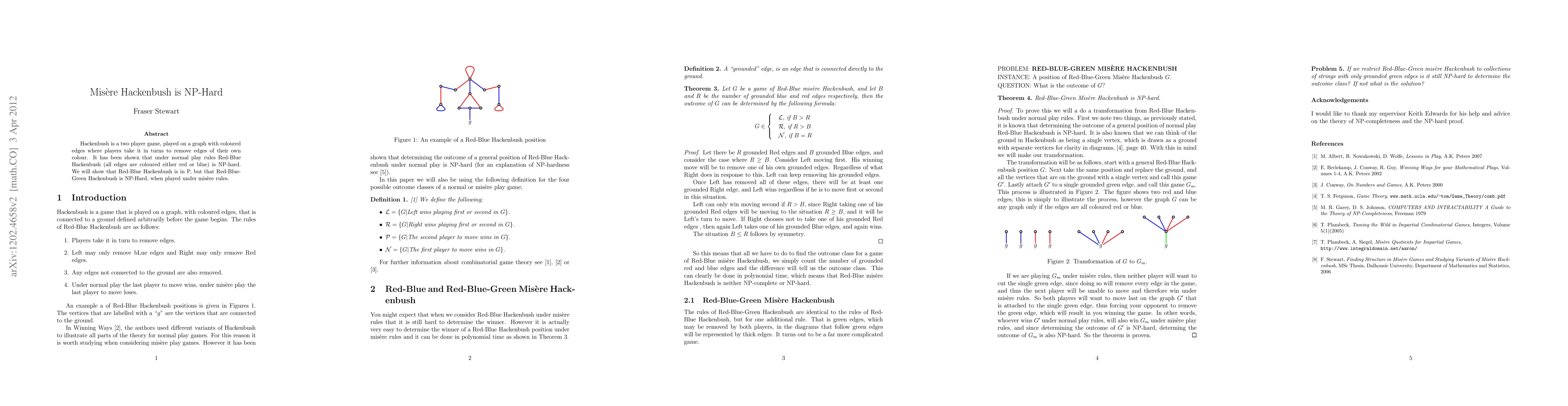 This paper demonstrates that Red-Blue Hackenbush is solvable in polynomial time (P), but Red-Blue-Green Hackenbush under misère rules is NP-hard. The complexity shift occurs with the addition of a third color and the misère play rules.