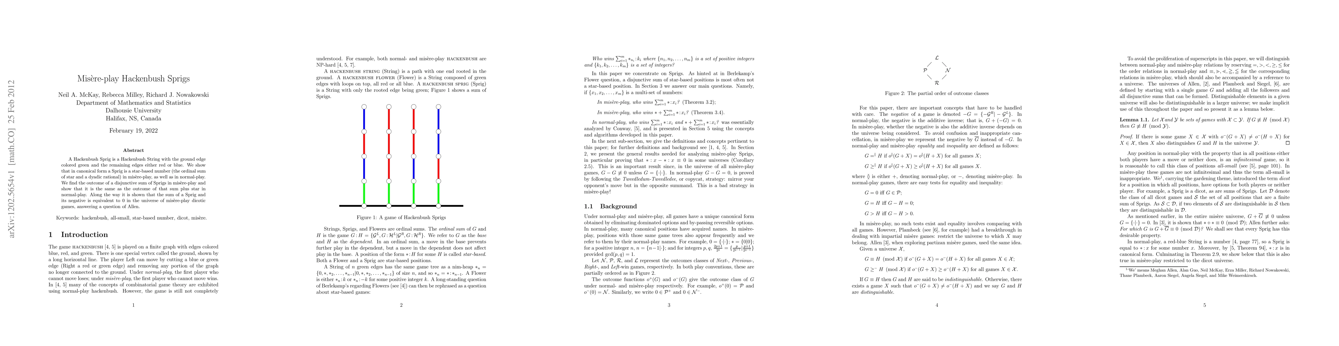 A Hackenbush Sprig is a Hackenbush String with the ground edge colored green and the remaining edges either red or blue. We show that in canonical form a Sprig is a star-based number (the ordinal sum of star and a dyadic rational) in mis\`ere-play, as well as in normal-play. We find the outcome of a disjunctive sum of Sprigs in mis\`ere-play and show that it is the same as the outcome of that sum plus star in normal-play. Along the way it is shown that the sum of a Sprig and its negative is equivalent to 0 in the universe of mis\`ere-play dicotic games, answering a question of Allen.
