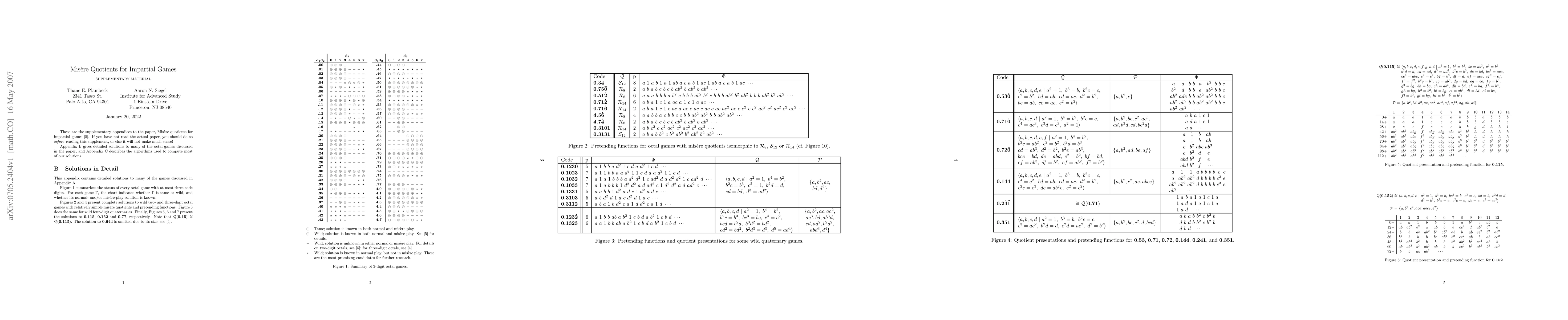 This paper offers supplementary material for the study on Misere quotients for impartial games, presenting detailed solutions to various octal games and explaining the algorithms employed to compute these solutions.