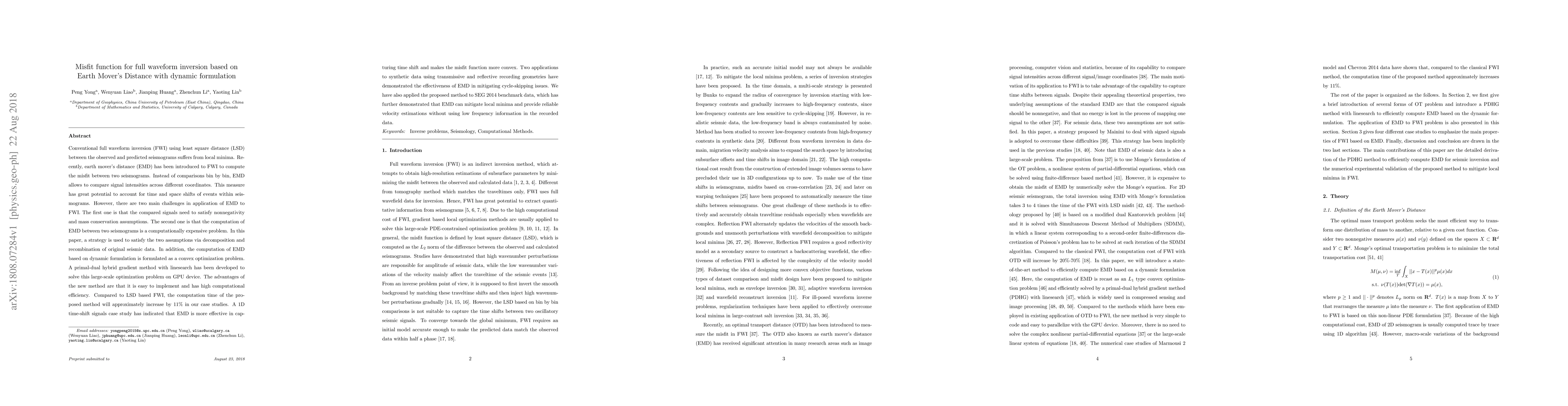 This paper proposes a misfit function for full waveform inversion using Earth Mover's Distance (EMD) to address local minima issues in conventional methods. The authors develop a dynamic formulation and convex optimization approach to efficiently compute EMD, demonstrating improved performance in capturing time shifts and mitigating cycle-skipping issues in synthetic and benchmark data.
