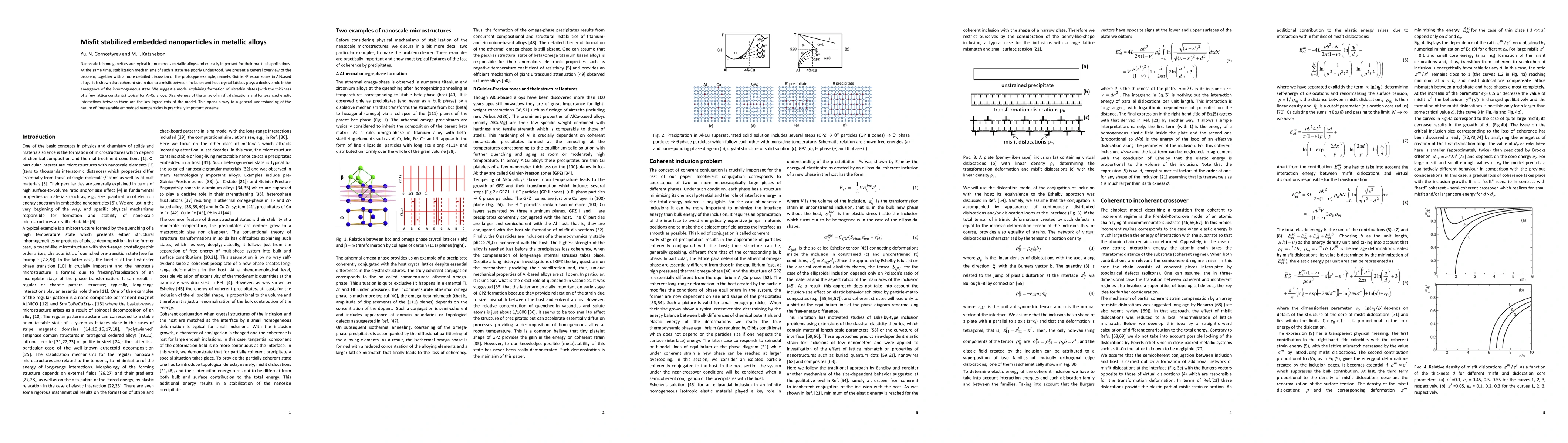 Nanoscale inhomogeneities are typical for numerous metallic alloys and crucially important for their practical applications. At the same time, stabilization mechanisms of such a state are poorly understood. We present a general overview of the problem, together with a more detailed discussion of the prototype example, namely, Guinier-Preston zones in Al-based alloys. It is shown that coherent strain due to a misfit between inclusion and host crystal lattices plays a decisive role in the emergence of the inhomogeneous state. We suggest a model explaining formation of ultrathin plates (with the thickness of a few lattice constants) typical for Al-Cu alloys. Discreteness of the array of misfit dislocations and long-ranged elastic interactions between them are the key ingredients of the model. This opens a way to a general understanding of the nature of (meta)stable embedded nanoparticles in practically important systems.