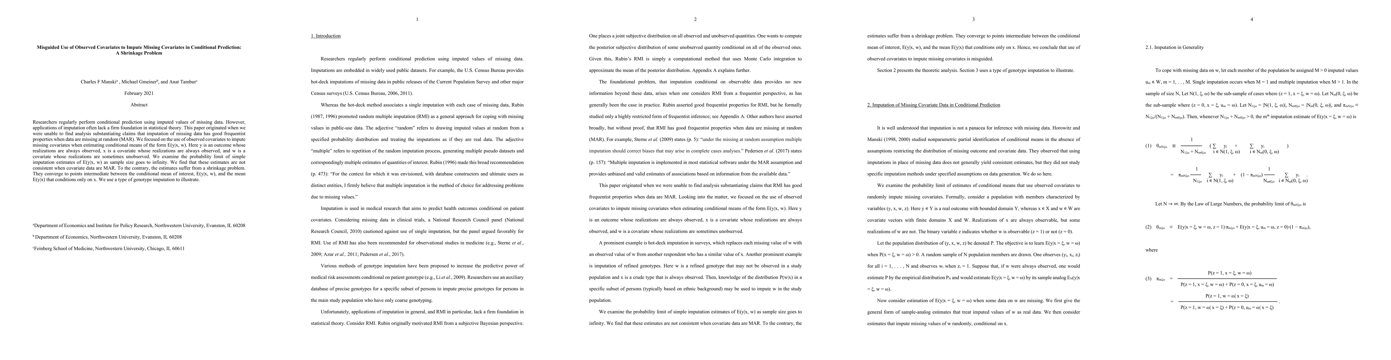 This paper investigates the inconsistency of using observed covariates to impute missing data for conditional prediction, finding that such imputations suffer from a shrinkage problem, converging to intermediate values rather than the true conditional mean. This challenges the frequentist properties of imputation methods when data are missing at random.