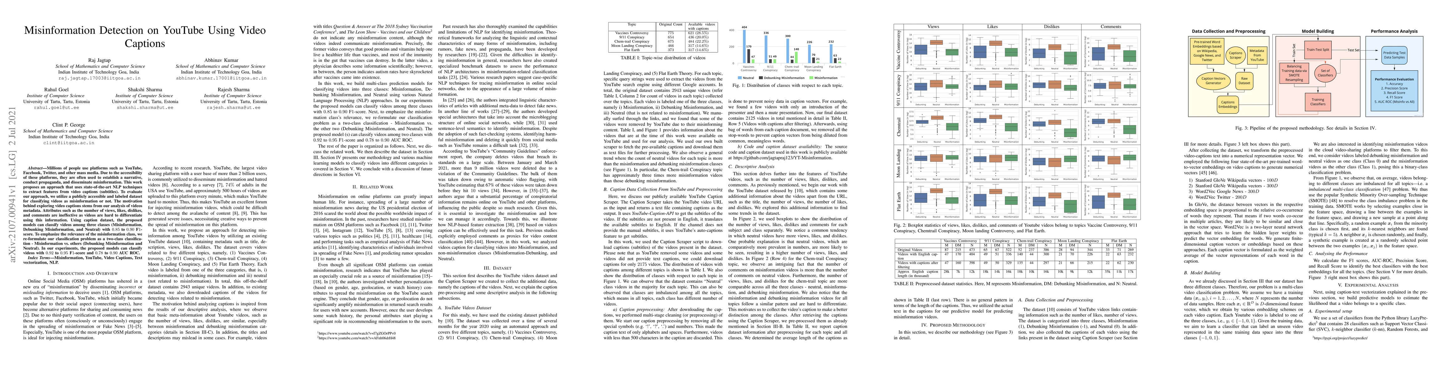 This paper proposes an NLP-based approach to detect misinformation on YouTube using video captions, achieving high F1-scores and AUC ROC values. It classifies videos into three categories: Misinformation, Debunking Misinformation, and Neutral, with improved performance when focusing on Misinformation vs. others.