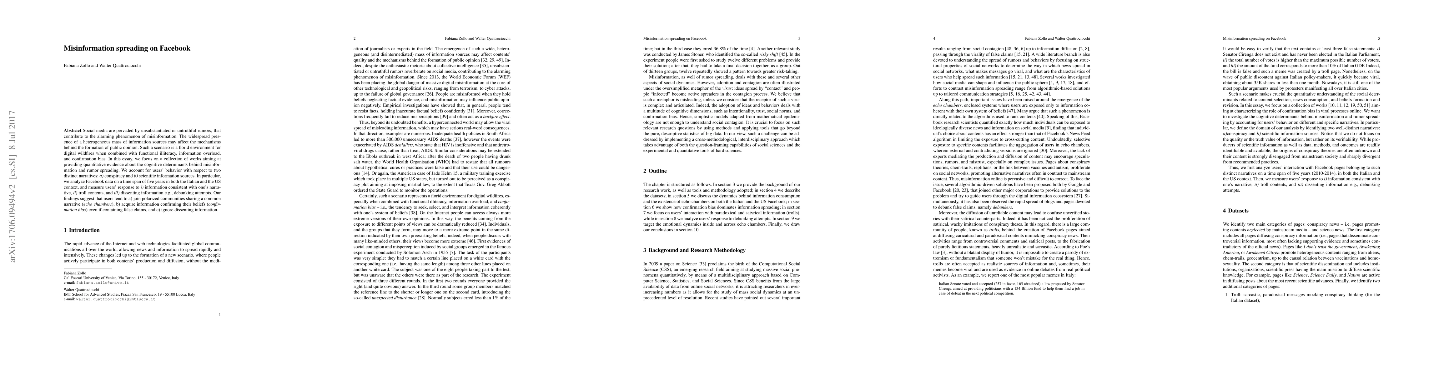 Social media are pervaded by unsubstantiated or untruthful rumors, that contribute to the alarming phenomenon of misinformation. The widespread presence of a heterogeneous mass of information sources may affect the mechanisms behind the formation of public opinion. Such a scenario is a florid environment for digital wildfires when combined with functional illiteracy, information overload, and confirmation bias. In this essay, we focus on a collection of works aiming at providing quantitative evidence about the cognitive determinants behind misinformation and rumor spreading. We account for users' behavior with respect to two distinct narratives: a) conspiracy and b) scientific information sources. In particular, we analyze Facebook data on a time span of five years in both the Italian and the US context, and measure users' response to i) information consistent with one's narrative, ii) troll contents, and iii) dissenting information e.g., debunking attempts. Our findings suggest that users tend to a) join polarized communities sharing a common narrative (echo chambers), b) acquire information confirming their beliefs (confirmation bias) even if containing false claims, and c) ignore dissenting information.