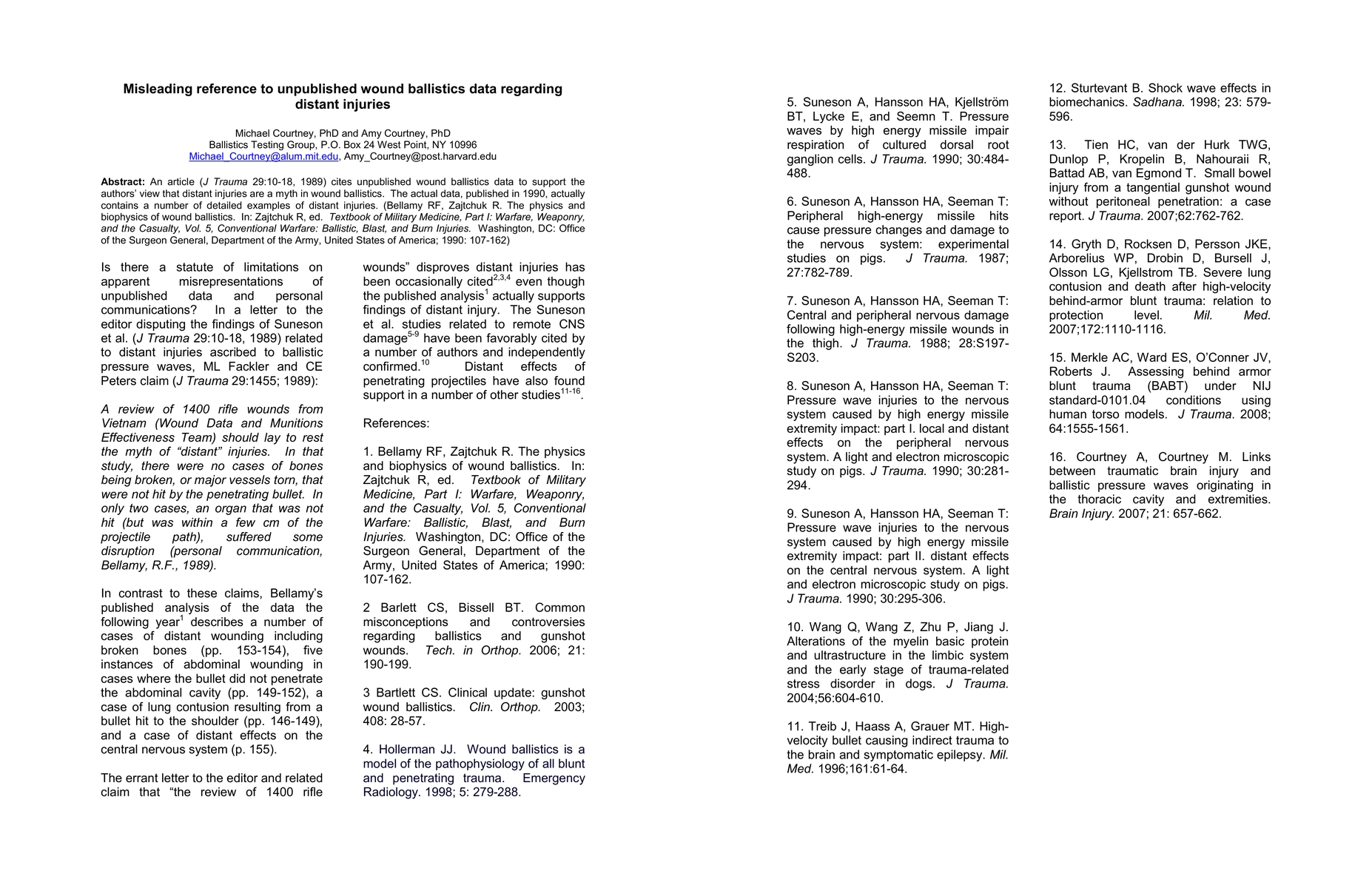 An article (J Trauma 29:10-18, 1989) cites unpublished wound ballistics data to support the authors' view that distant injuries are a myth in wound ballistics. The actual data, published in 1990, actually contains a number of detailed examples of distant injuries. (Bellamy RF, Zajtchuk R. The physics and biophysics of wound ballistics. In: Zajtchuk R, ed. Textbook of Military Medicine, Part I: Warfare, Weaponry, and the Casualty, Vol. 5, Conventional Warfare: Ballistic, Blast, and Burn Injuries. Washington, DC: Office of the Surgeon General, Department of the Army, United States of America; 1990: 107-162.)