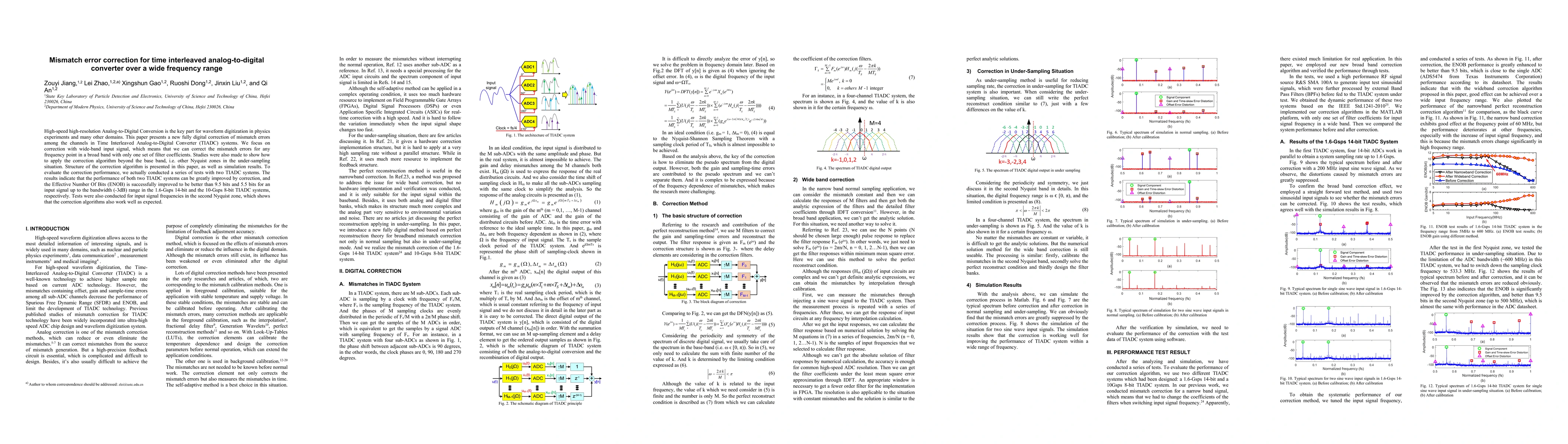 This paper introduces a fully digital correction method for mismatch errors in Time Interleaved Analog-to-Digital Converters (TIADC), enabling high-speed, high-resolution conversion over a wide frequency range. The proposed algorithm improves the Effective Number Of Bits (ENOB) to over 9.5 bits in a 1.6-Gsps 14-bit system and 5.5 bits in a 10-Gsps 8-bit system, demonstrating effective performance even in the second Nyquist zone.