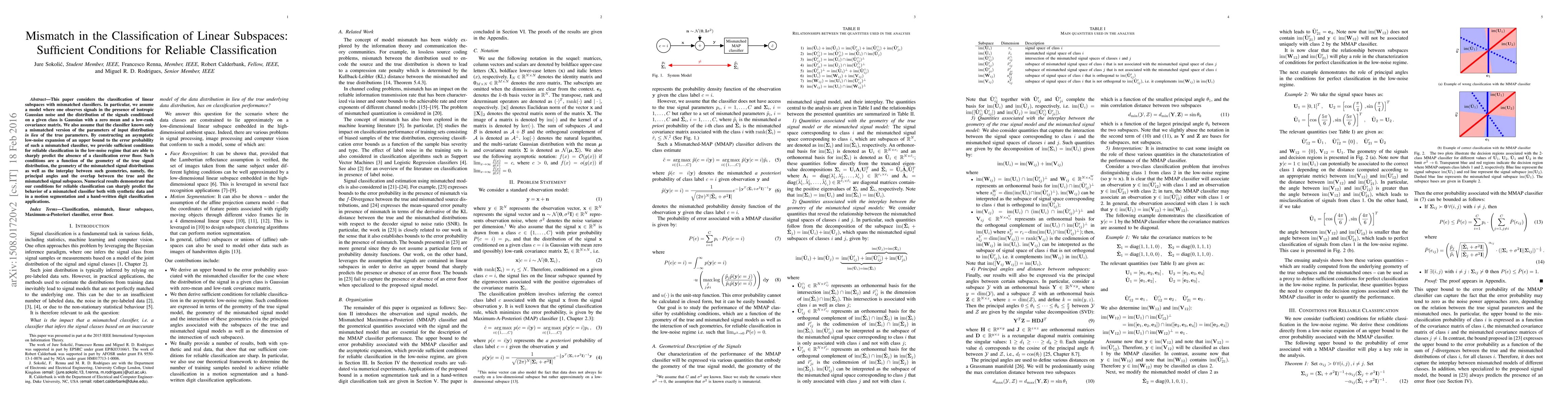This paper considers the classification of linear subspaces with mismatched classifiers. In particular, we assume a model where one observes signals in the presence of isotropic Gaussian noise and the distribution of the signals conditioned on a given class is Gaussian with a zero mean and a low-rank covariance matrix. We also assume that the classifier knows only a mismatched version of the parameters of input distribution in lieu of the true parameters. By constructing an asymptotic low-noise expansion of an upper bound to the error probability of such a mismatched classifier, we provide sufficient conditions for reliable classification in the low-noise regime that are able to sharply predict the absence of a classification error floor. Such conditions are a function of the geometry of the true signal distribution, the geometry of the mismatched signal distributions as well as the interplay between such geometries, namely, the principal angles and the overlap between the true and the mismatched signal subspaces. Numerical results demonstrate that our conditions for reliable classification can sharply predict the behavior of a mismatched classifier both with synthetic data and in a motion segmentation and a hand-written digit classification applications.