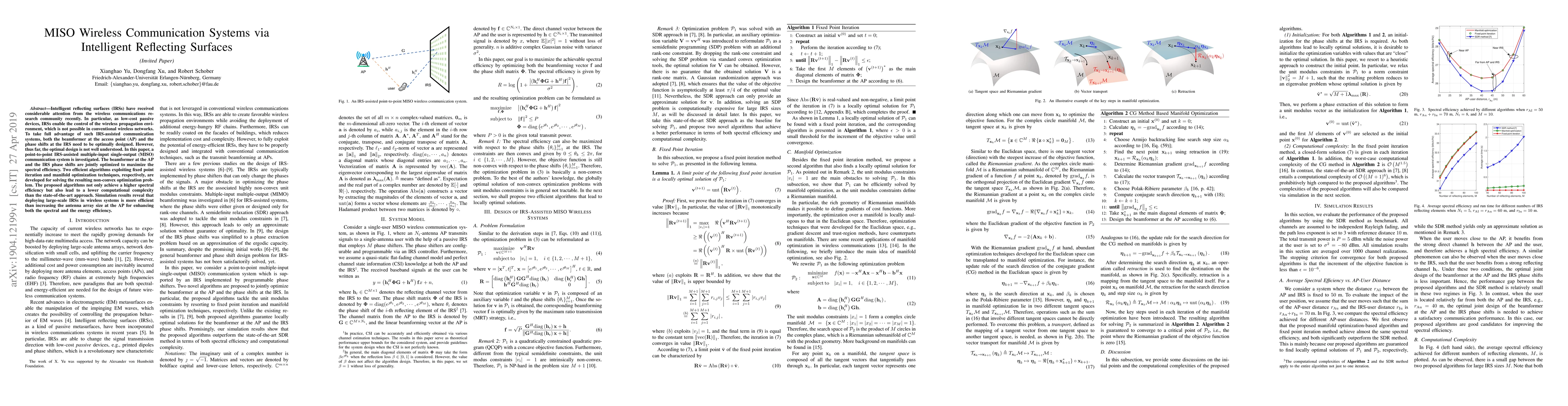 Intelligent reflecting surfaces (IRSs) have received considerable attention from the wireless communications research community recently. In particular, as low-cost passive devices, IRSs enable the control of the wireless propagation environment, which is not possible in conventional wireless networks. To take full advantage of such IRS-assisted communication systems, both the beamformer at the access point (AP) and the phase shifts at the IRS need to be optimally designed. However, thus far, the optimal design is not well understood. In this paper, a point-to-point IRS-assisted multiple-input single-output (MISO) communication system is investigated. The beamformer at the AP and the IRS phase shifts are jointly optimized to maximize the spectral efficiency. Two efficient algorithms exploiting fixed point iteration and manifold optimization techniques, respectively, are developed for solving the resulting non-convex optimization problem. The proposed algorithms not only achieve a higher spectral efficiency but also lead to a lower computational complexity than the state-of-the-art approach. Simulation results reveal that deploying large-scale IRSs in wireless systems is more efficient than increasing the antenna array size at the AP for enhancing both the spectral and the energy efficiency.