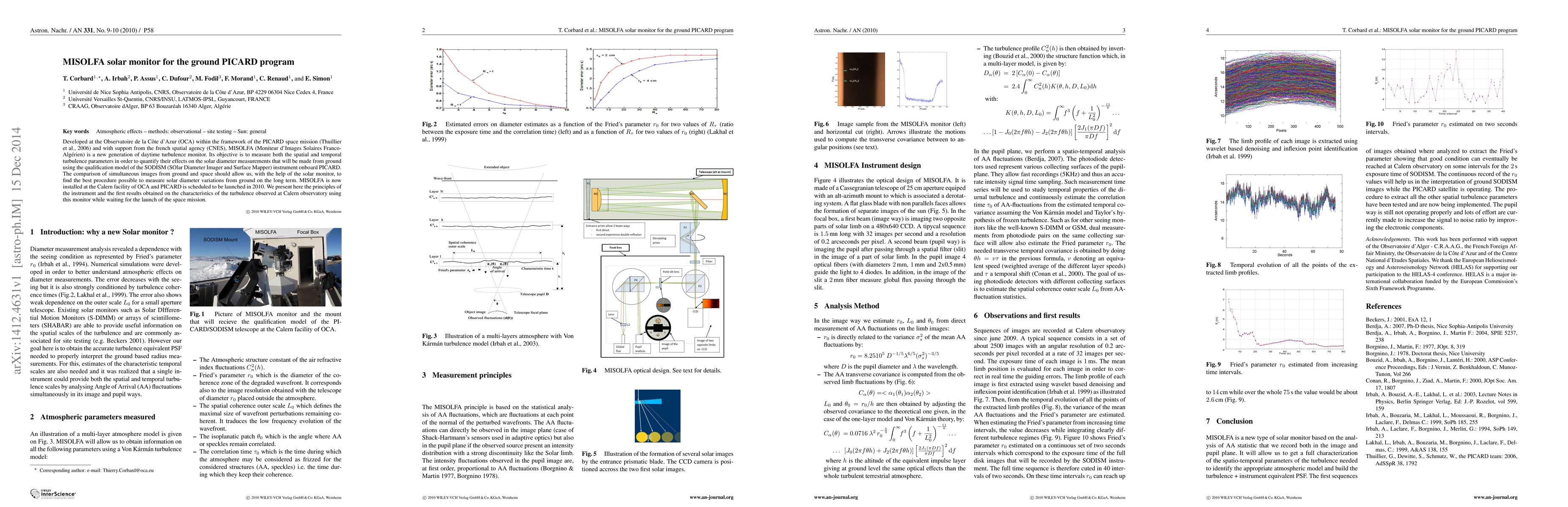 Developed at the Observatoire de la C\^ote d'Azur (OCA) within the framework of the PICARD space mission (Thuillier et al., 2006) and with support from the french spatial agency (CNES), MISOLFA (Moniteur d'Images Solaires Franco-Alg\'erien) is a new generation of daytime turbulence monitor. Its objective is to measure both the spatial and temporal turbulence parameters in order to quantify their effects on the solar diameter measurements that will be made from ground using the qualification model of the SODISM (SOlar Diameter Imager and Surface Mapper) instrument onboard PICARD. The comparison of simultaneous images from ground and space should allow us, with the help of the solar monitor, to find the best procedure possible to measure solar diameter variations from ground on the long term. MISOLFA is now installed at the Calern facility of OCA and PICARD is scheduled to be launched in 2010. We present here the principles of the instrument and the first results obtained on the characteristics of the turbulence observed at Calern observatory using this monitor while waiting for the launch of the space mission.