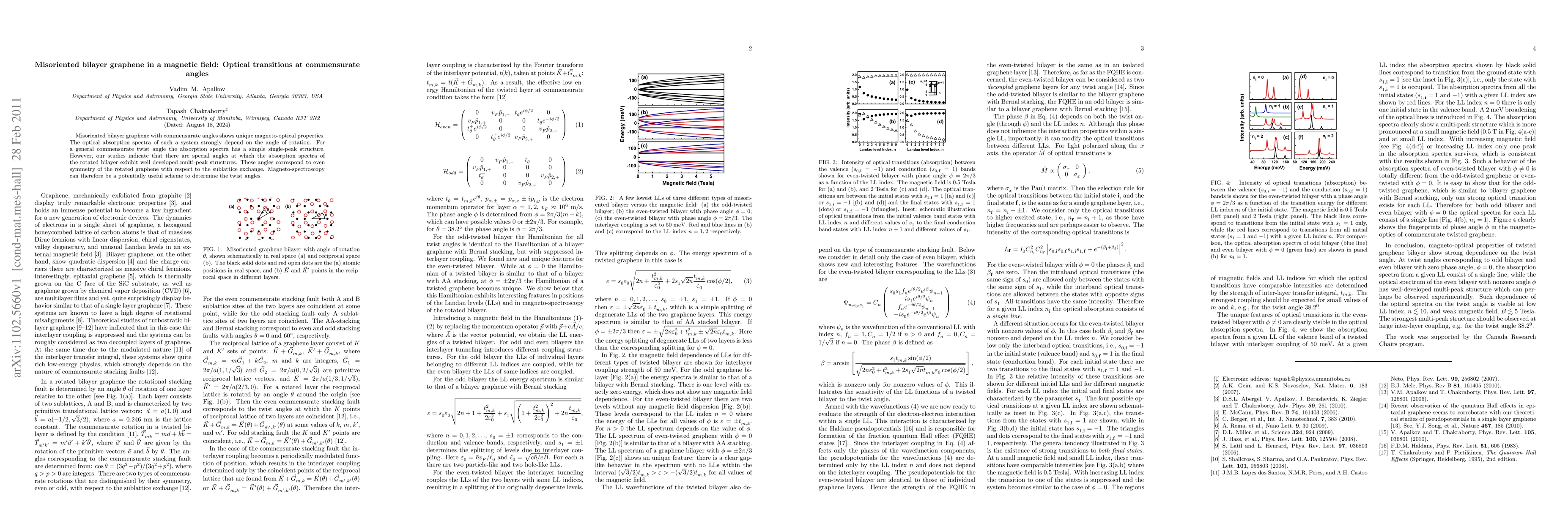 Misoriented bilayer graphene exhibits unique magneto-optical properties that vary with rotation angle; specific twist angles lead to multi-peak absorption spectra, revealing even symmetry and enabling precise determination of twist angles via magneto-spectroscopy.
