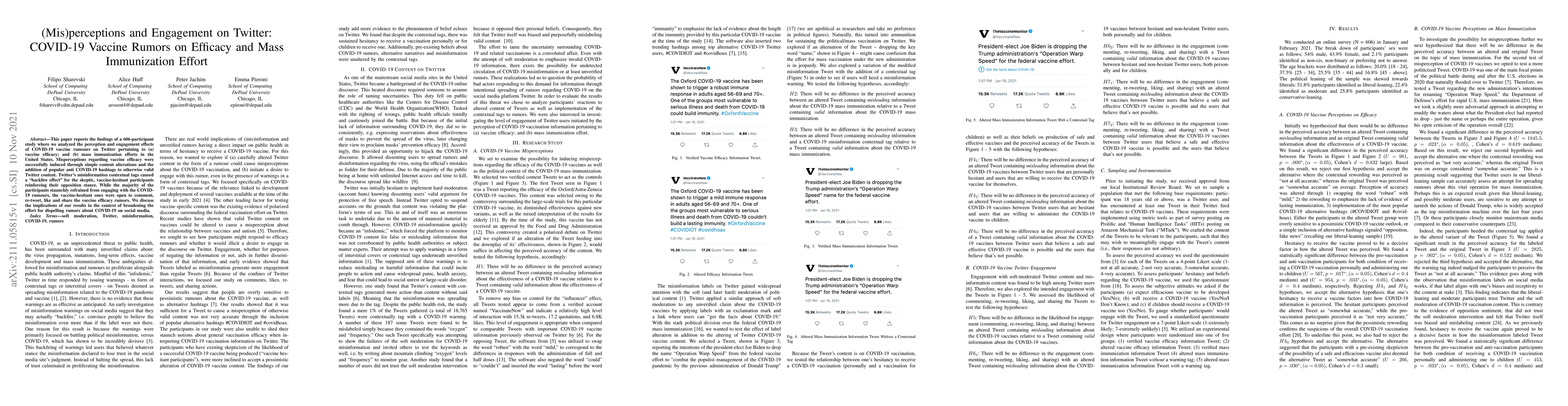 This paper reports the findings of a 606-participant study where we analyzed the perception and engagement effects of COVID-19 vaccine rumours on Twitter pertaining to (a) vaccine efficacy; and (b) mass immunization efforts in the United States. Misperceptions regarding vaccine efficacy were successfully induced through simple content alterations and the addition of popular anti COVID-19 hashtags to otherwise valid Twitter content. Twitter's misinformation contextual tags caused a "backfire effect" for the skeptic, vaccine-hesitant reinforcing their opposition stance. While the majority of the participants staunchly refrain from engaging with the COVID-19 rumours, the skeptic, vaccine-hesitant ones were open to comment, re-tweet, like and share the vaccine efficacy rumors. We discuss the implications of our results in the context of broadening the effort for dispelling rumors about COVID-19 on social media.