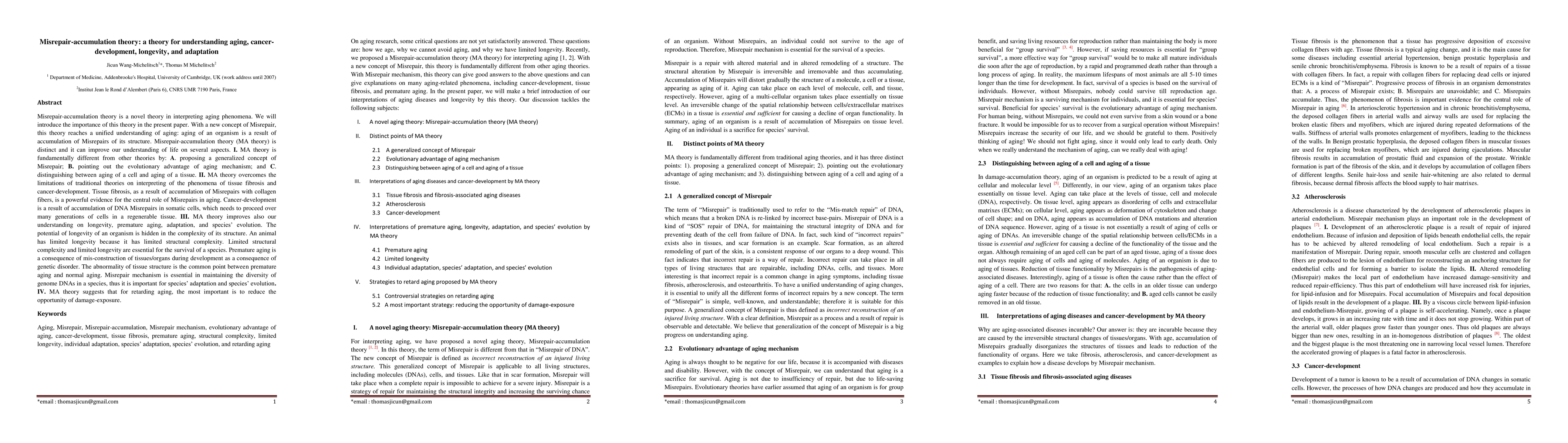 Misrepair accumulation theory posits that aging results from the accumulation of structural Misrepairs, offering a unified understanding of aging, cancer, and longevity. It highlights evolutionary advantages of aging mechanisms and suggests reducing damage exposure is key to retarding aging.