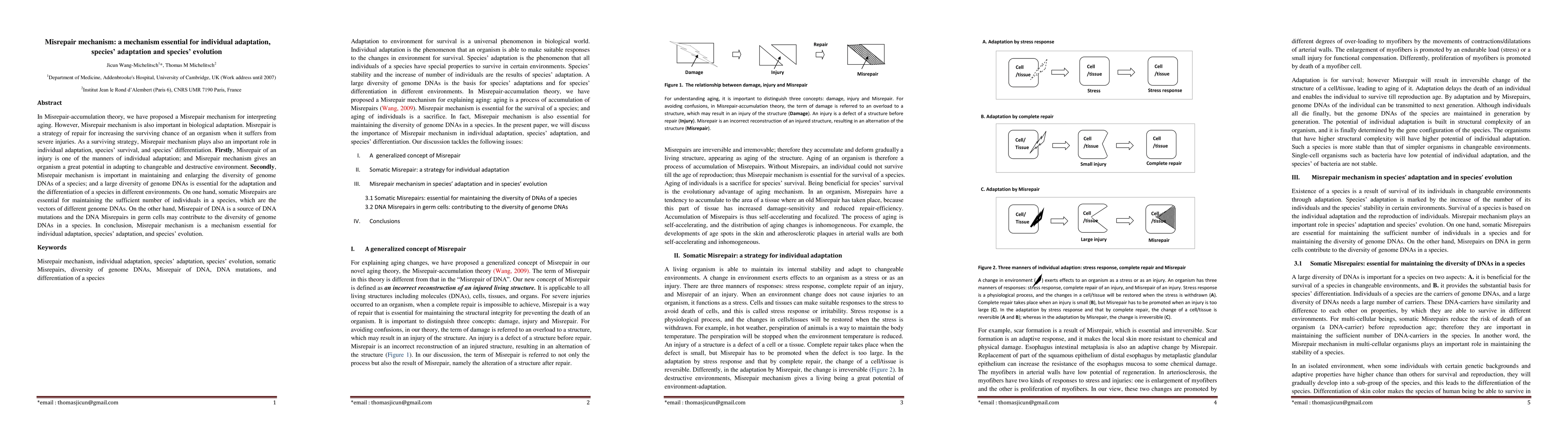 In Misrepair-accumulation theory, we have proposed a Misrepair mechanism for interpreting aging. However, Misrepair mechanism is also important in biological adaptation. Misrepair is a strategy of repair for increasing the surviving chance of an organism when it suffers from severe injuries. As a surviving strategy, Misrepair mechanism plays also an important role in individual adaptation, species survival, and species differentiation. Firstly, Misrepair of an injury is one of the manners of individual adaptation; and Misrepair mechanism gives an organism a great potential in adapting to changeable and destructive environment. Secondly, Misrepair mechanism is important in maintaining and enlarging the diversity of genome DNAs of a species; and a large diversity of genome DNAs is essential for the adaptation and the differentiation of a species in different environments. On one hand, somatic Misrepairs are essential for maintaining the sufficient number of individuals in a species, which are the vectors of different genome DNAs. On the other hand, Misrepair of DNA is a source of DNA mutations and the DNA Misrepairs in germ cells may contribute to the diversity of genome DNAs in a species. In conclusion, Misrepair mechanism is a mechanism essential for individual adaptation, species adaptation, and species evolution.