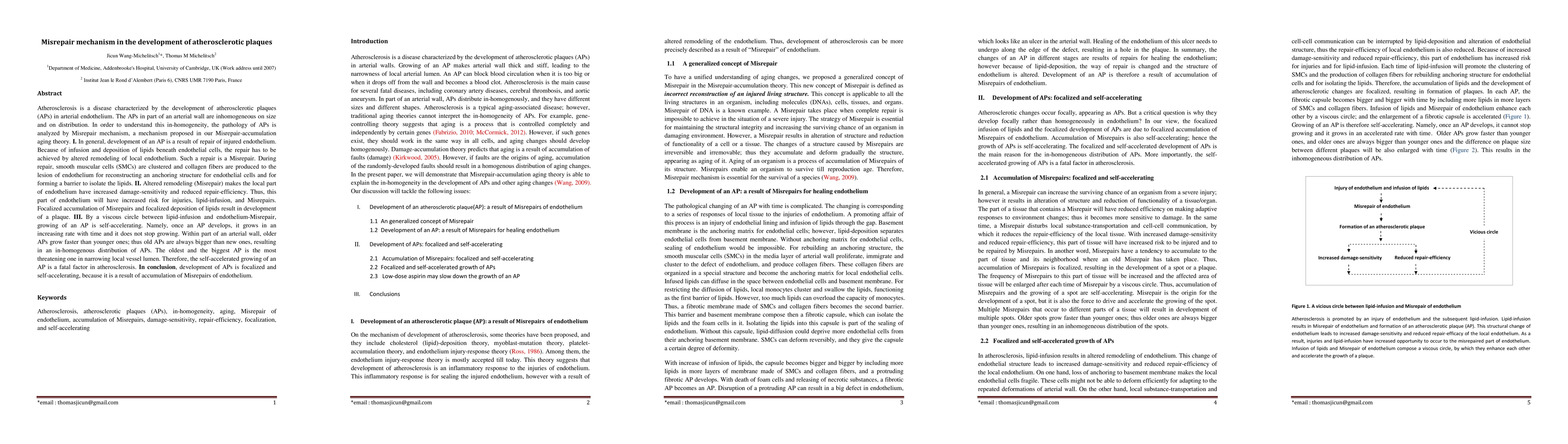 This paper explores the misrepair mechanism in the development of atherosclerotic plaques (APs), proposing that APs grow through a self-accelerating cycle of endothelial injury, lipid deposition, and misrepair, leading to increasingly severe plaque formation.