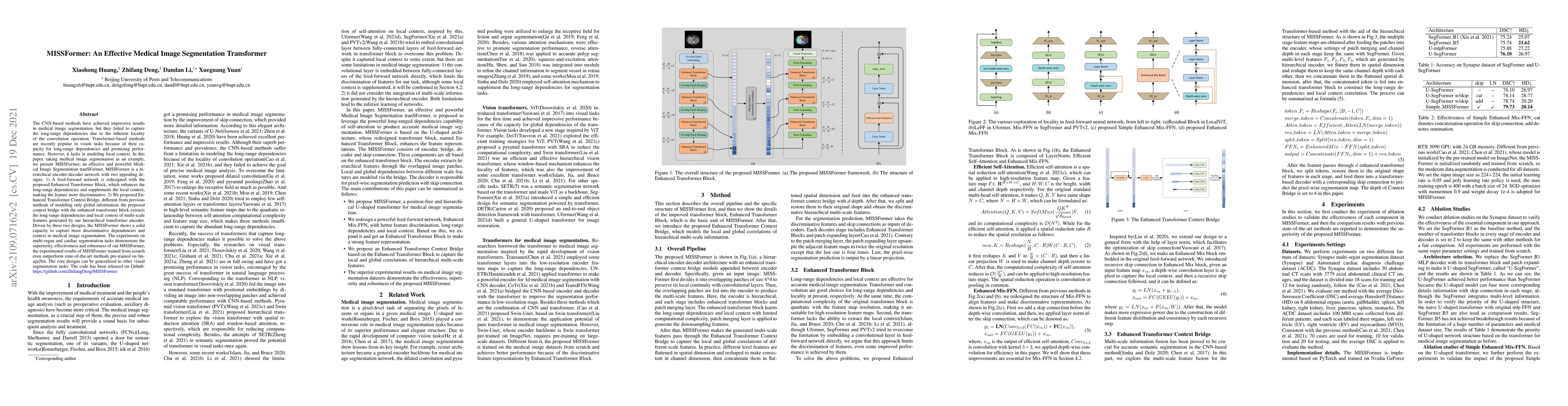 The paper introduces MISSFormer, a hierarchical encoder-decoder Transformer model for medical image segmentation that combines long-range dependency capture with local context modeling. Experiments show superior performance on multi-organ and cardiac segmentation tasks, even outperforming ImageNet-pretrained state-of-the-art methods.