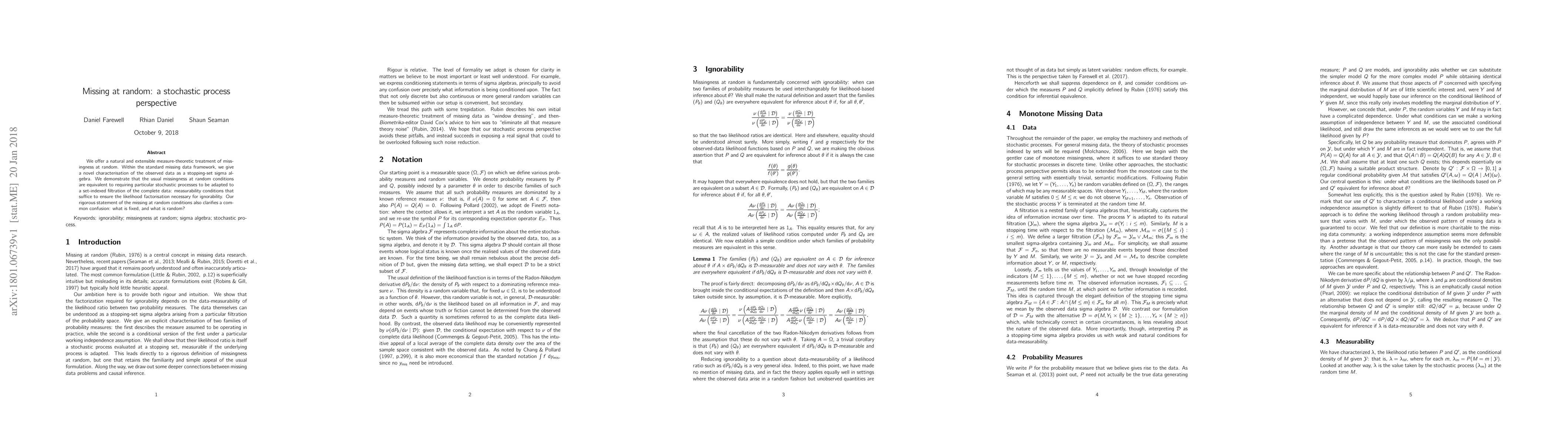 This paper provides a measure-theoretic framework for understanding missing at random data, characterizing observed data as a stopping-set sigma algebra and showing that missingness at random conditions are met when specific stochastic processes are adapted to a set-indexed filtration of complete data. The rigorous treatment clarifies the distinction between fixed and random elements in the missing data context.