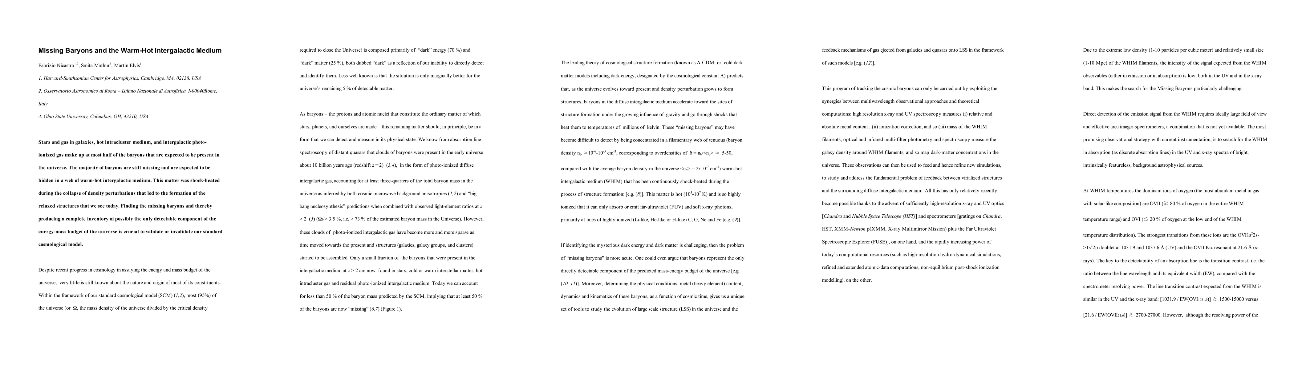 This paper investigates the elusive baryons, which constitute most of the universe's mass, focusing on the warm-hot intergalactic medium that likely harbors the missing baryons. Identifying this component is vital for validating the standard cosmological model.