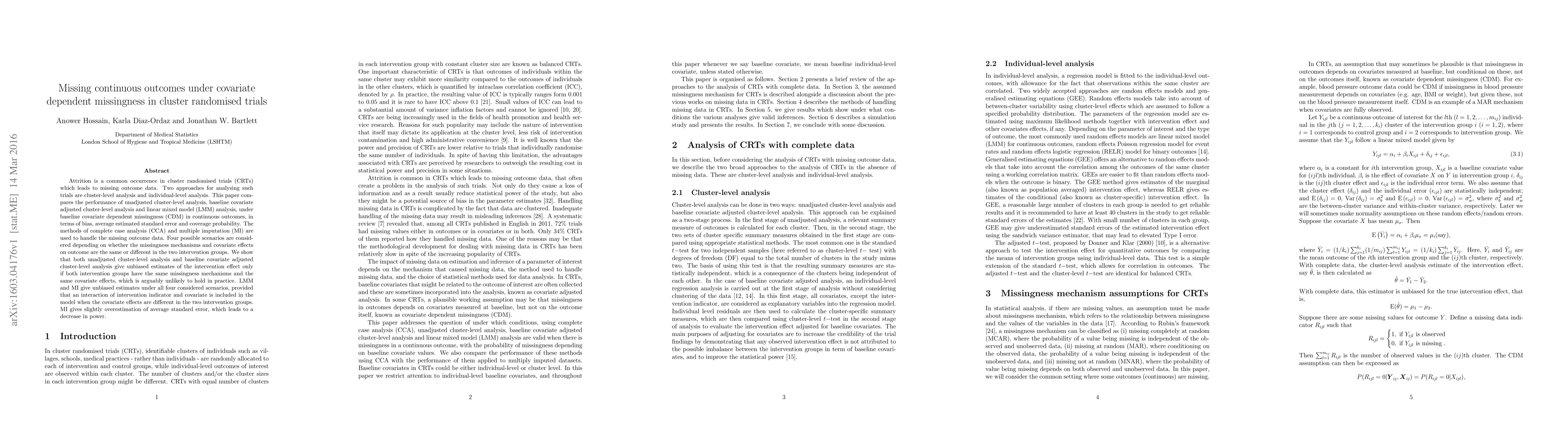 This paper evaluates the performance of different analytical methods for handling missing continuous outcomes under covariate dependent missingness in cluster randomised trials, finding that linear mixed models and multiple imputation provide unbiased estimates across various scenarios, while cluster-level analyses may be biased unless specific conditions are met.