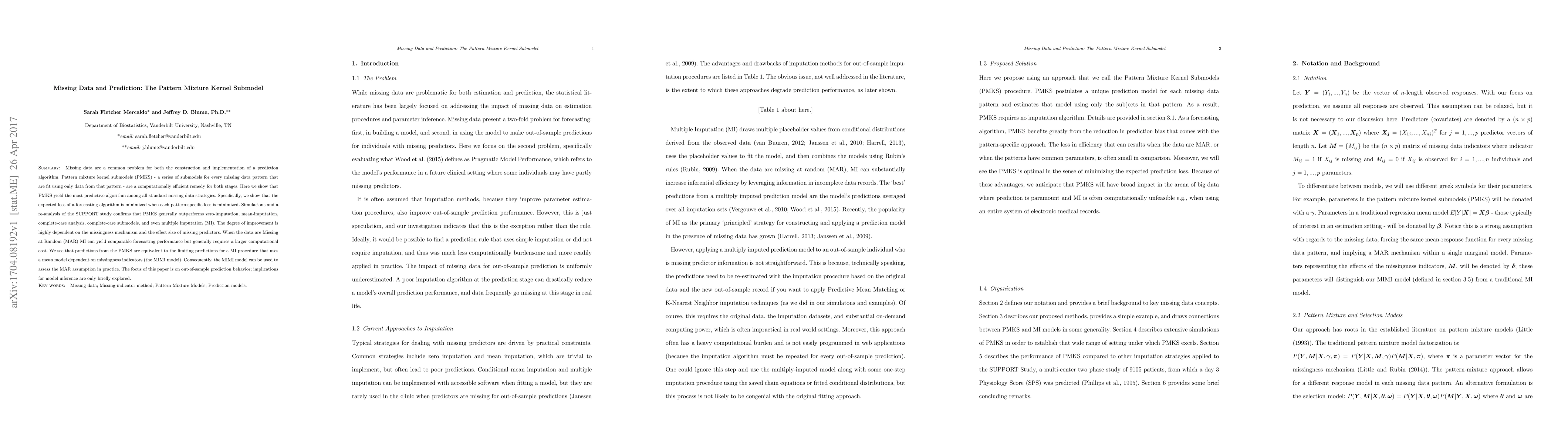 This paper proposes pattern mixture kernel submodels (PMKS) as an efficient method for handling missing data in prediction algorithms, demonstrating superior predictive performance compared to standard strategies like zero-imputation, mean-imputation, and multiple imputation. PMKS generally outperform these methods, especially when data are Missing at Random (MAR).