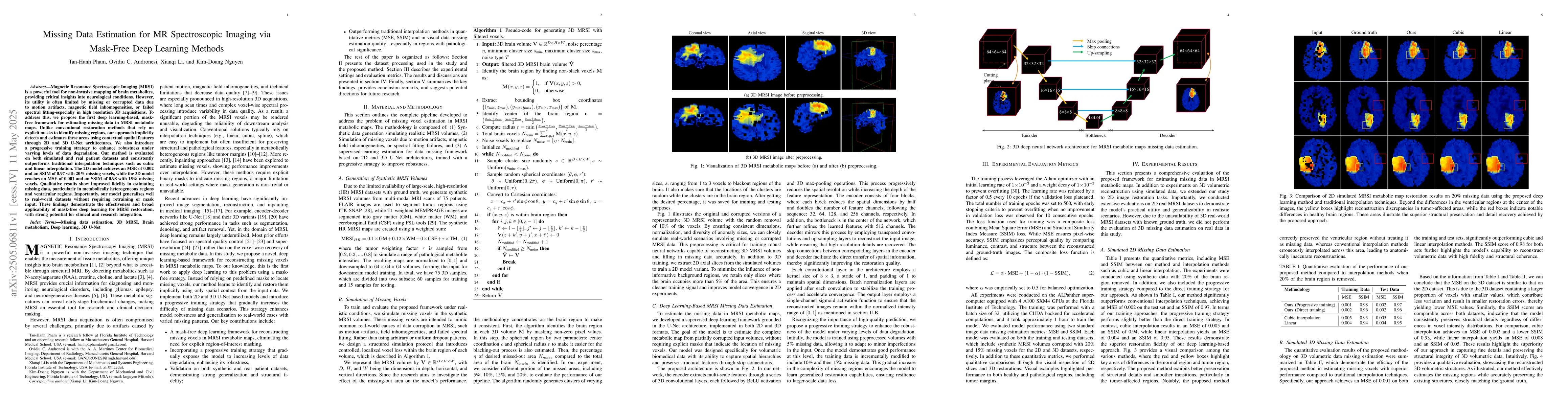The development of a novel mask-free deep learning framework for estimating missing data in MRSI metabolic maps using 2D and 3D U-Net architectures with a progressive training strategy.