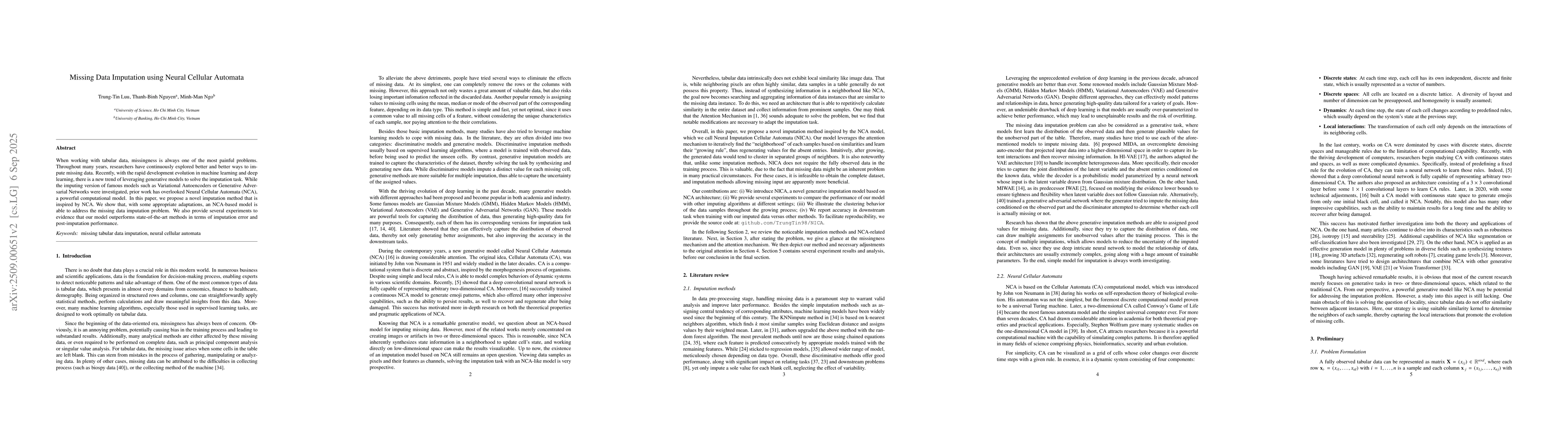When working with tabular data, missingness is always one of the most painful problems. Throughout many years, researchers have continuously explored better and better ways to impute missing data. Recently, with the rapid development evolution in machine learning and deep learning, there is a new trend of leveraging generative models to solve the imputation task. While the imputing version of famous models such as Variational Autoencoders or Generative Adversarial Networks were investigated, prior work has overlooked Neural Cellular Automata (NCA), a powerful computational model. In this paper, we propose a novel imputation method that is inspired by NCA. We show that, with some appropriate adaptations, an NCA-based model is able to address the missing data imputation problem. We also provide several experiments to evidence that our model outperforms state-of-the-art methods in terms of imputation error and post-imputation performance.