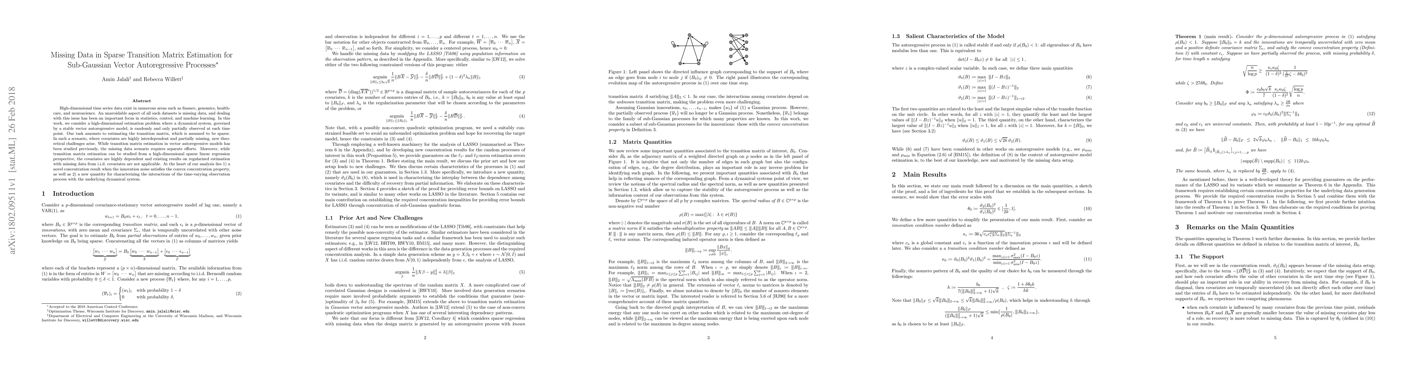 This paper addresses the challenge of estimating a sparse transition matrix in high-dimensional vector autoregressive processes with missing data. It introduces novel concentration results for sub-Gaussian noise and a new measure to characterize the interaction between the observation process and the dynamical system, providing theoretical foundations for effective estimation in such complex scenarios.