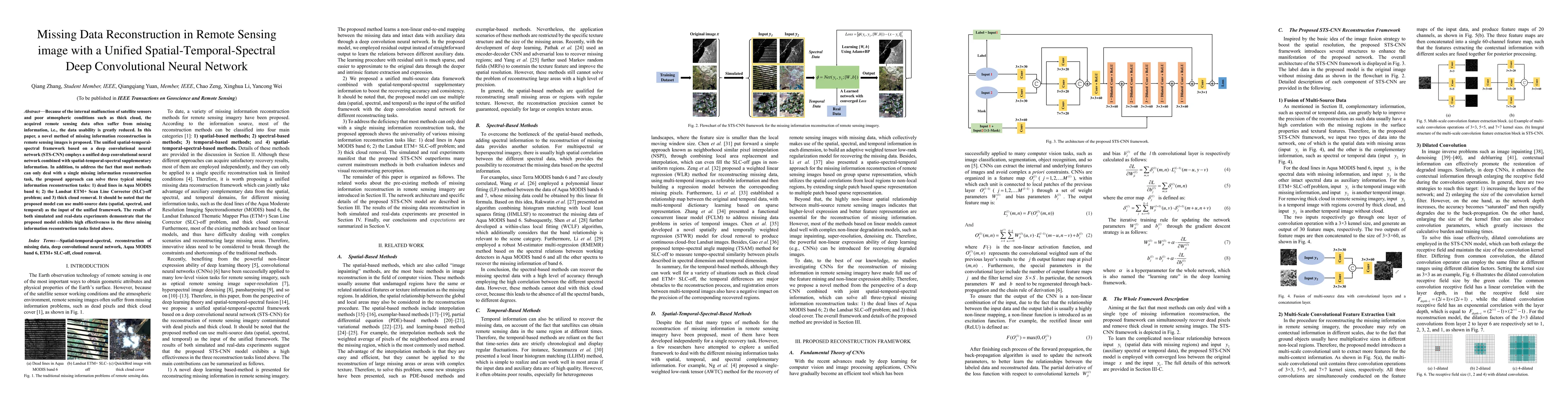 This paper proposes a unified spatial-temporal-spectral deep convolutional neural network (STS-CNN) for reconstructing missing data in remote sensing images, addressing issues like dead lines, SLC-off problems, and cloud removal. The model effectively integrates multi-source data and demonstrates high performance in real-world applications.