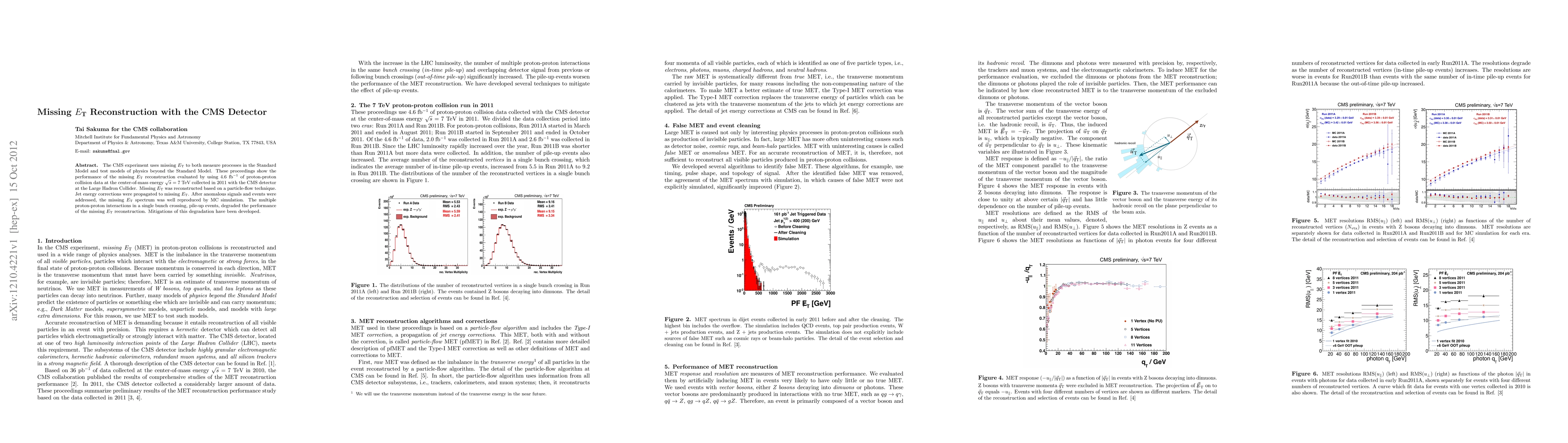 The CMS experiment uses missing E_T to both measure processes in the Standard Model and test models of physics beyond the Standard Model. These proceedings show the performance of the missing E_T reconstruction evaluated by using 4.6 fb-1 of proton-proton collision data at the center-of-mass energy 7 TeV collected in 2011 with the CMS detector at the Large Hadron Collider. Missing E_T was reconstructed based on a particle-flow technique. Jet energy corrections were propagated to missing E_T. After anomalous signals and events were addressed, the missing E_T spectrum was well reproduced by MC simulation. The multiple proton-proton interactions in a single bunch crossing, pile-up events, degraded the performance of the missing E_T reconstruction. Mitigations of this degradation have been developed.