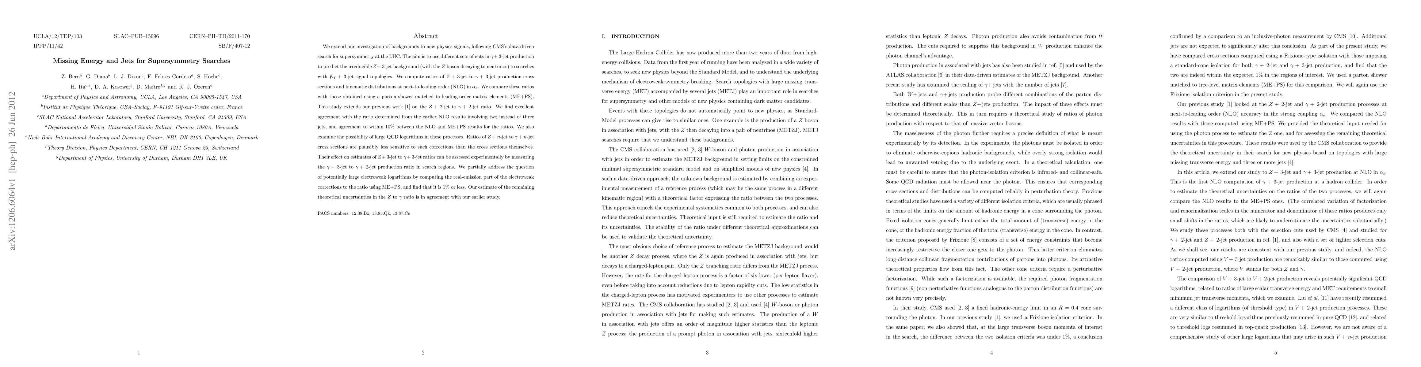 We extend our investigation of backgrounds to new physics signals, following CMS's data-driven search for supersymmetry at the LHC. The aim is to use different sets of cuts in gamma + 3-jet production to predict the irreducible Z + 3-jet background (with the Z boson decaying to neutrinos) to searches with missing transverse energy + 3-jet signal topologies. We compute ratios of Z + 3-jet to gamma + 3-jet production cross sections and kinematic distributions at next-to-leading order (NLO) in alpha_s. We compare these ratios with those obtained using a parton shower matched to leading-order matrix elements (ME+PS). This study extends our previous work [arXiv:1106.1423 [hep-ph]] on the Z + 2-jet to gamma + 2-jet ratio. We find excellent agreement with the ratio determined from the earlier NLO results involving two instead of three jets, and agreement to within 10% between the NLO and ME+PS results for the ratios. We also examine the possibility of large QCD logarithms in these processes. Ratios of Z + n-jet to gamma + n-jet cross sections are plausibly less sensitive to such corrections than the cross sections themselves. Their effect on estimates of Z + 3-jet to gamma + 3-jet ratios can be assessed experimentally by measuring the gamma + 3-jet to gamma + 2-jet production ratio in search regions. We partially address the question of potentially large electroweak logarithms by computing the real-emission part of the electroweak corrections to the ratio using ME+PS, and find that it is 1% or less. Our estimate of the remaining theoretical uncertainties in the Z to gamma ratio is in agreement with our earlier study.
