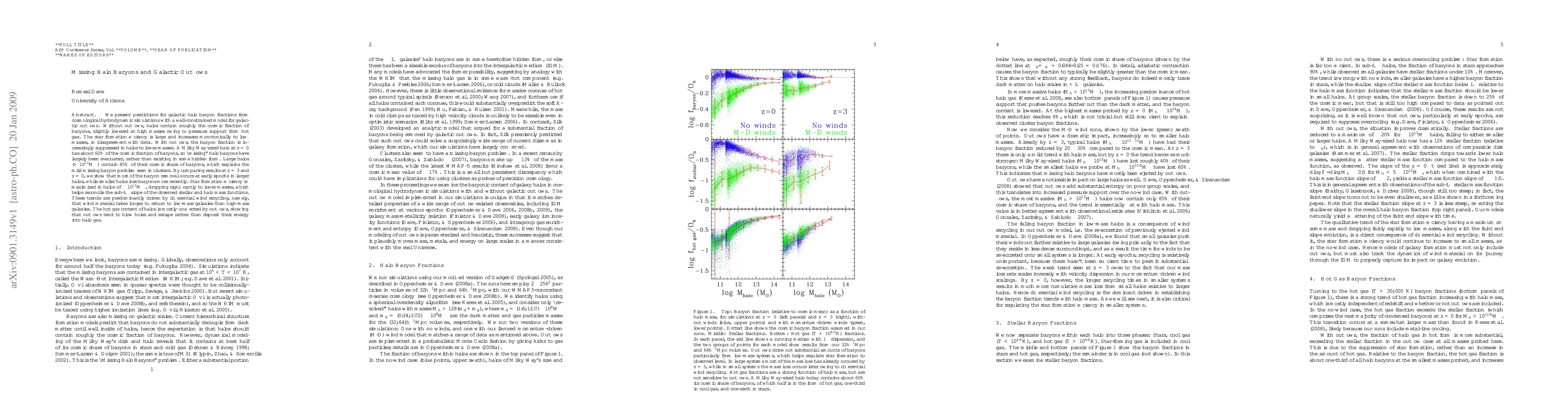 We present predictions for galactic halo baryon fractions from cosmological hydrodynamic simulations with a well-constrained model for galactic outflows. Without outflows, halos contain roughly the cosmic fraction of baryons, slightly lowered at high masses owing to pressure support from hot gas. The star formation efficiency is large and increases monotonically to low masses, in disagreement with data. With outflows, the baryon fraction is increasingly suppressed in halos to lower masses. A Milky Way-sized halo at z=0 has about 60% of the cosmic fraction of baryons, so "missing" halo baryons have largely been evacuated, rather than existing in some hidden form. Large halos (>10^13 Mo) contain 85% of their cosmic share of baryons, which explains the mild missing baryon problem seen in clusters. By comparing results at z=3 and z=0, we show that most of the baryon removal occurs at early epochs in larger halos, while smaller halos lose baryons more recently. Star formation efficiency is maximized in halos of ~10^13 Mo, dropping significantly to lower masses, which helps reconcile the sub-L* slope of the observed stellar and halo mass functions. These trends are predominantly driven by differential wind recycling, namely, that wind material takes longer to return to low-mass galaxies than high-mass galaxies. The hot gas content of halos is mostly unaffected by outflows, showing that outflows tend to blow holes and escape rather than deposit their energy into halo gas.