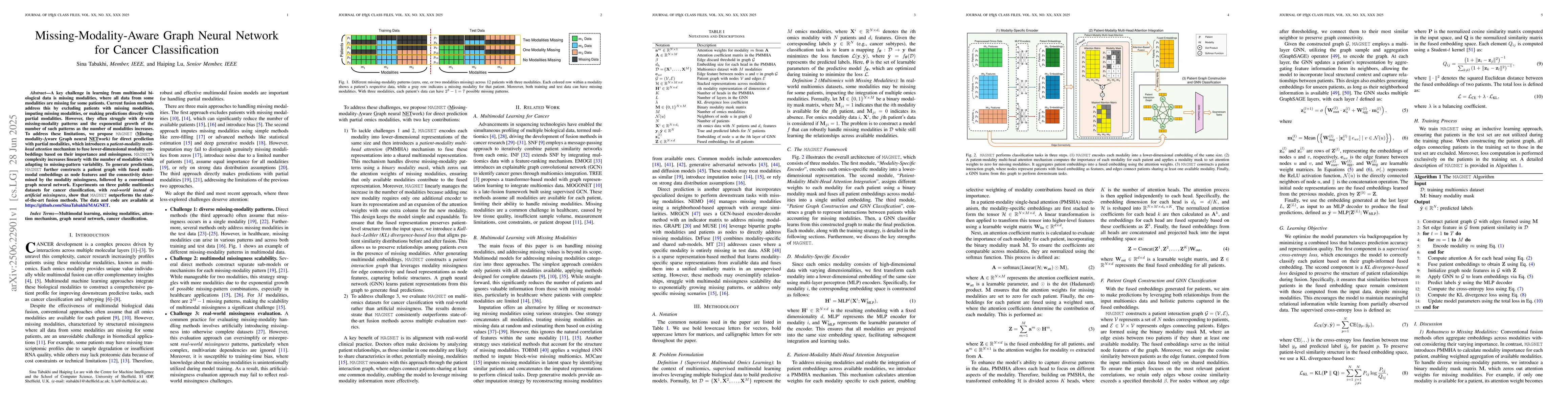 A key challenge in learning from multimodal biological data is missing modalities, where all data from some modalities are missing for some patients. Current fusion methods address this by excluding patients with missing modalities, imputing missing modalities, or making predictions directly with partial modalities. However, they often struggle with diverse missing-modality patterns and the exponential growth of the number of such patterns as the number of modalities increases. To address these limitations, we propose MAGNET (Missing-modality-Aware Graph neural NETwork) for direct prediction with partial modalities, which introduces a patient-modality multi-head attention mechanism to fuse lower-dimensional modality embeddings based on their importance and missingness. MAGNET's complexity increases linearly with the number of modalities while adapting to missing-pattern variability. To generate predictions, MAGNET further constructs a patient graph with fused multimodal embeddings as node features and the connectivity determined by the modality missingness, followed by a conventional graph neural network. Experiments on three public multiomics datasets for cancer classification, with real-world instead of artificial missingness, show that MAGNET outperforms the state-of-the-art fusion methods. The data and code are available at https://github.com/SinaTabakhi/MAGNET.