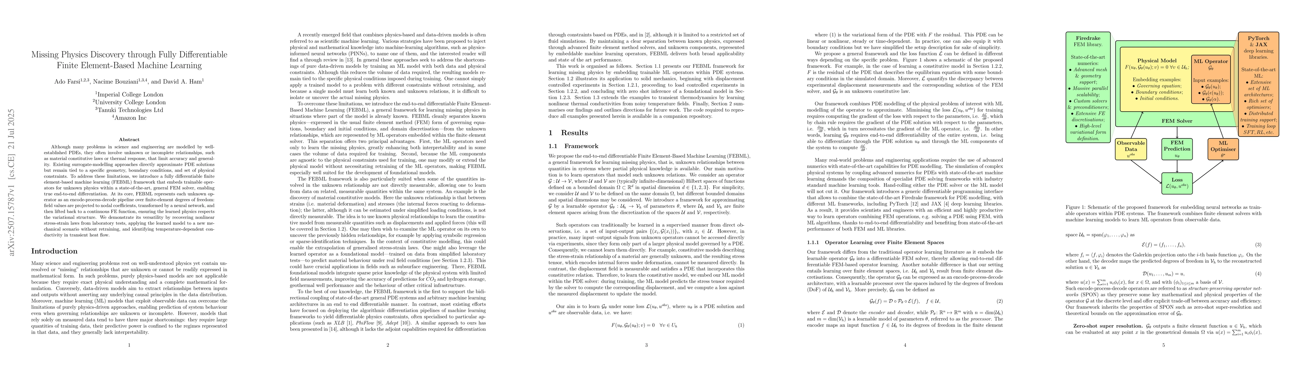 Although many problems in science and engineering are modelled by well-established PDEs, they often involve unknown or incomplete relationships, such as material constitutive laws or thermal response, that limit accuracy and generality. Existing surrogate-modelling approaches directly approximate PDE solutions but remain tied to a specific geometry, boundary conditions, and set of physical constraints. To address these limitations, we introduce a fully differentiable finite element-based machine learning (FEBML) framework that embeds trainable operators for unknown physics within a state-of-the-art, general FEM solver, enabling true end-to-end differentiation. At its core, FEBML represents each unknown operator as an encode-process-decode pipeline over finite-element degrees of freedom: field values are projected to nodal coefficients, transformed by a neural network, and then lifted back to a continuous FE function, ensuring the learned physics respects the variational structure. We demonstrate its versatility by recovering nonlinear stress-strain laws from laboratory tests, applying the learned model to a new mechanical scenario without retraining, and identifying temperature-dependent conductivity in transient heat flow.