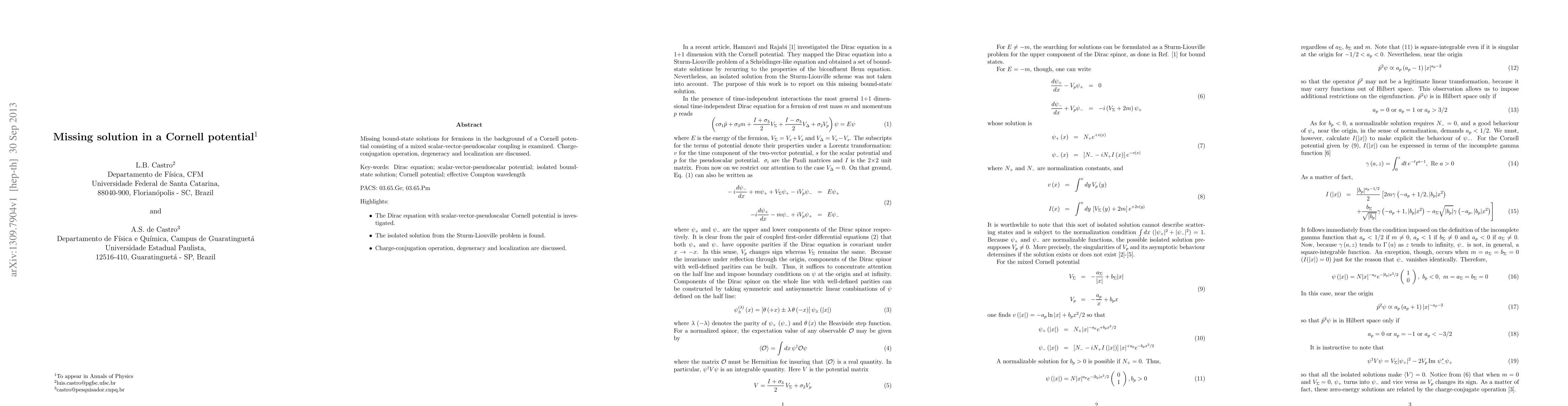 Missing bound-state solutions for fermions in the background of a Cornell potential consisting of a mixed scalar-vector-pseudoscalar coupling is examined. Charge-conjugation operation, degeneracy and localization are discussed.