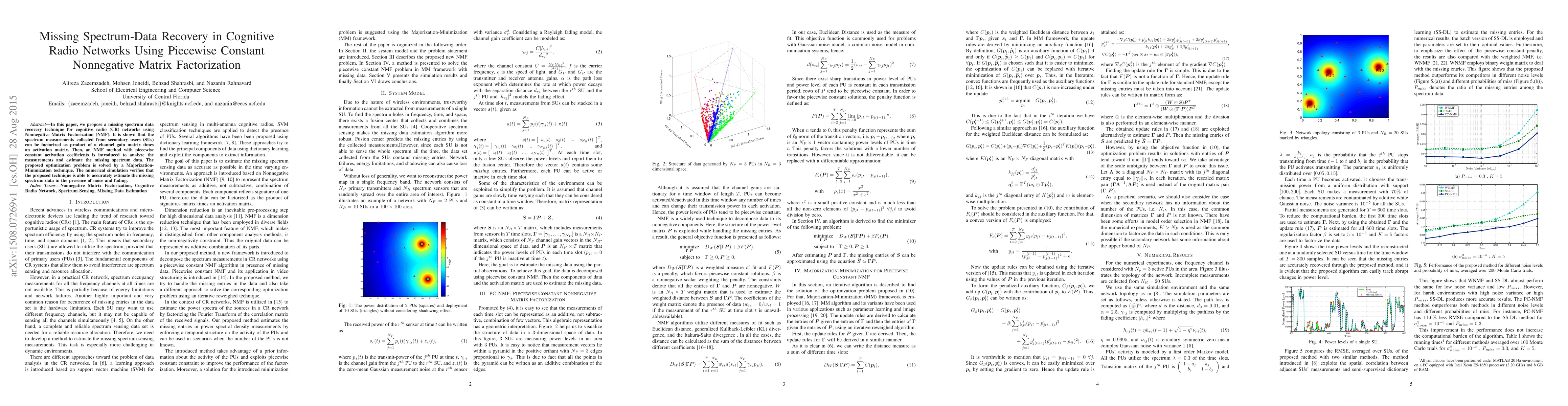 This paper proposes a method for recovering missing spectrum data in cognitive radio networks using Nonnegative Matrix Factorization (NMF) with piecewise constant activation coefficients. The technique estimates missing spectrum data by solving an optimization problem via Majorization-Minimization, demonstrating accurate recovery in simulations.