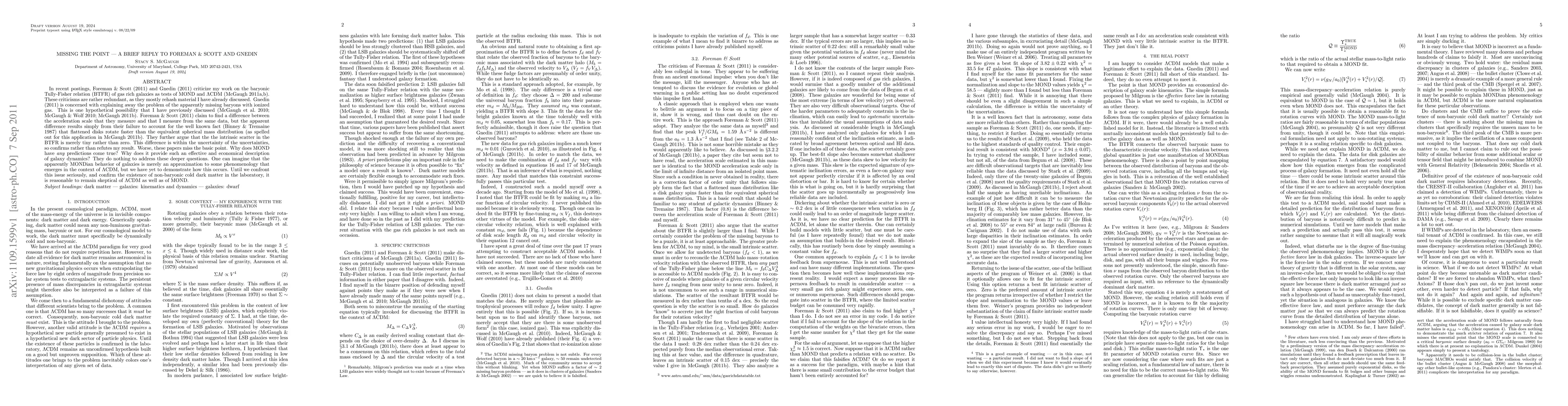 In recent postings, Foreman & Scott and Gnedin criticize my work on the baryonic Tully-Fisher relation (BTFR) of gas rich galaxies as tests of MOND and LCDM (McGaugh 2011a,b). These criticisms are rather redundant, as they mostly rehash material I have already discussed. Gnedin is concerned with explaining away the problem of the apparently missing baryons with ionized gas. This is one hypothetical possibility that I have previously discussed (McGaugh et al. 2010; McGaugh & Wolf 2010; McGaugh 2011b). Foreman & Scott claim to find a difference between the acceleration scale that they measure and that I measure from the same data, but the apparent difference results simply from their failure to account for the well known fact (Binney & Tremaine 1987) that flattened disks rotate faster than the equivalent spherical mass distribution (as spelled out for this application in McGaugh 2011b). They further argue that the the intrinsic scatter in the BTFR is merely tiny rather than zero. This difference is within the uncertainty of the uncertainties, so confirms rather than refutes my result. Worse, these papers miss the basic point. Why does MOND have any predictions come true? Why does it provide such an effective and economical description of galaxy dynamics? They do nothing to address these deeper questions. One can imagine that the apparently MONDian behavior of galaxies is merely an approximation to some phenomenology that emerges in the context of LCDM, but we have yet to demonstrate how this occurs. Until we confront this issue seriously, and confirm the existence of non-baryonic cold dark matter in the laboratory, it is reasonable to remain skeptical of LCDM as well as of MOND.