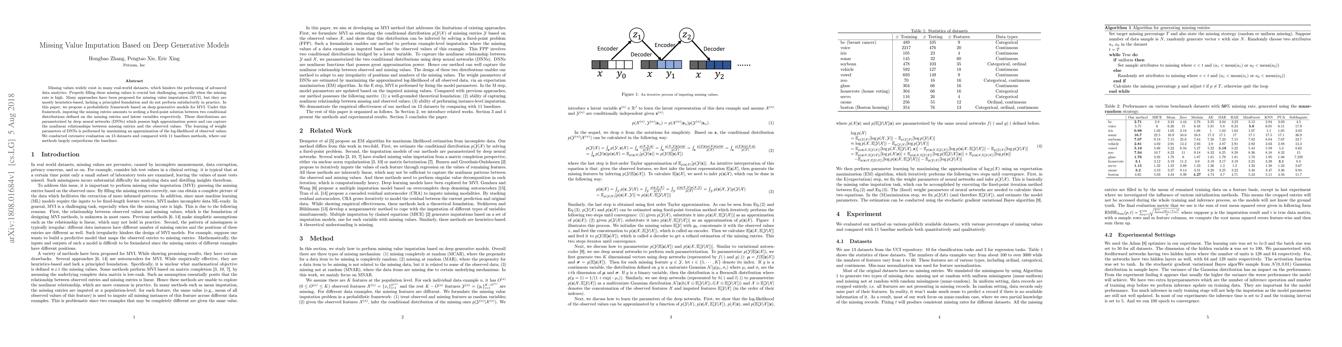 This paper proposes a probabilistic framework for missing value imputation (MVI) using deep generative models, where the imputation process involves finding a fixed-point solution between conditional distributions parameterized by deep neural networks. The method outperforms 11 baselines in extensive evaluations on 13 datasets.