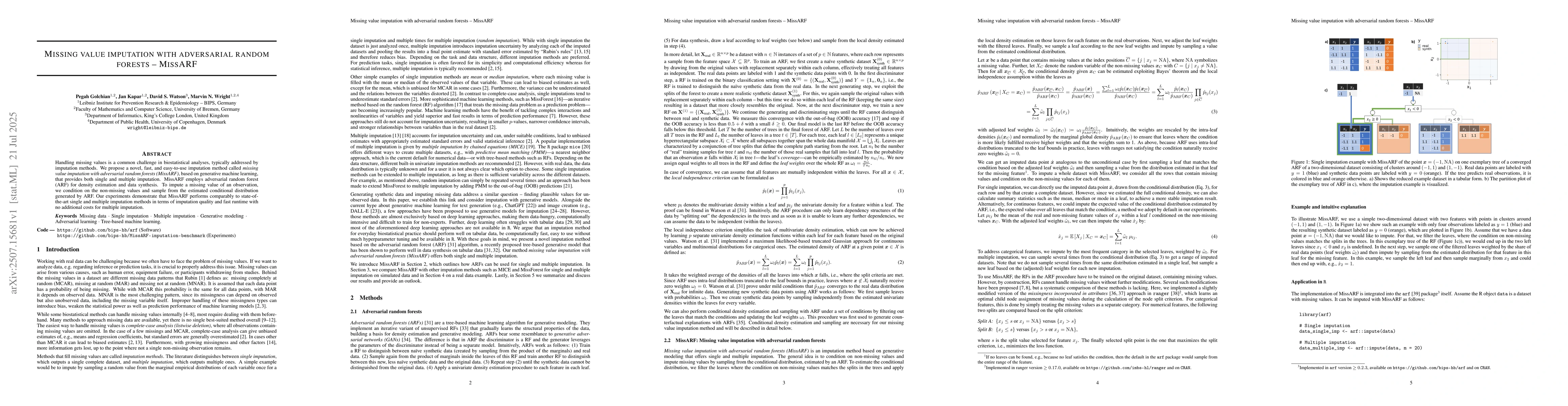 The research proposes MissARF, a missing value imputation method using adversarial random forests (ARF) for density estimation and data synthesis, providing both single and multiple imputation.