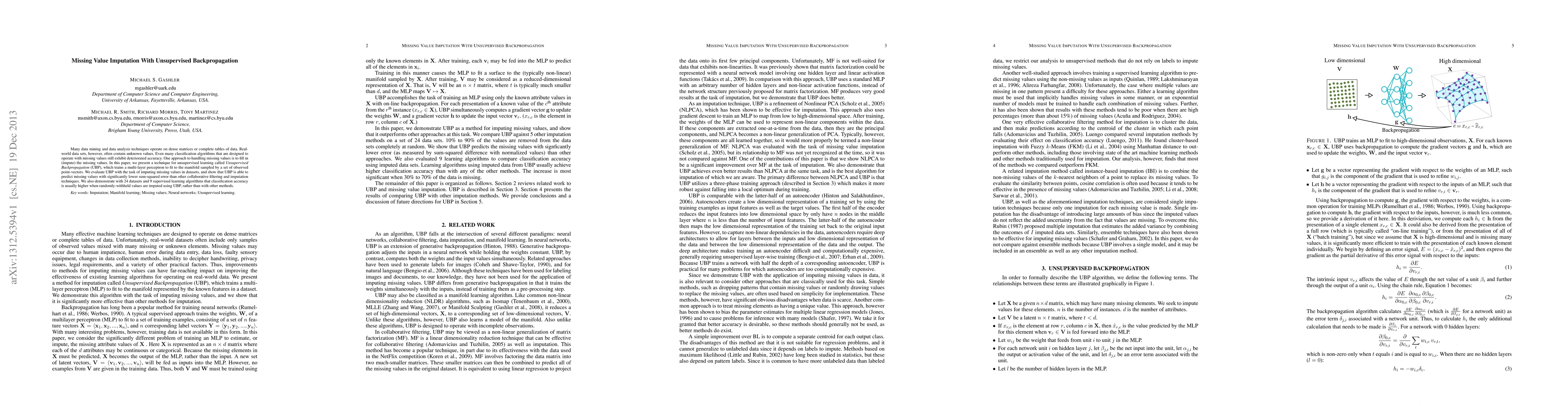 A new technique called Unsupervised Backpropagation (UBP) is presented for imputing missing values in datasets with improved accuracy compared to other methods. UBP outperforms collaborative filtering and traditional imputation techniques in both classification accuracy and sum-squared error.