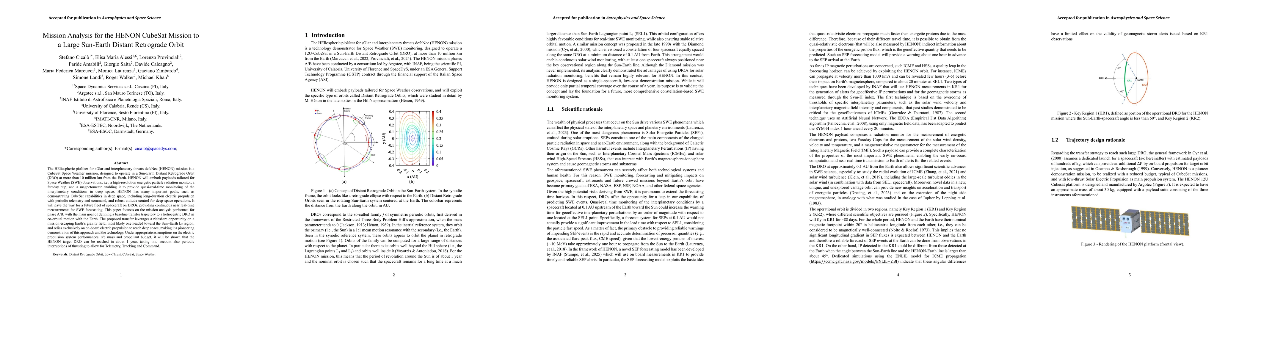 The HEliospheric pioNeer for sOlar and interplanetary threats defeNce (HENON) mission is a CubeSat Space Weather mission, designed to operate in a Sun-Earth Distant Retrograde Orbit (DRO) at more than 10 million km from Earth. HENON will embark payloads tailored for Space Weather (SWE) observations: a high-resolution energetic particle radiation monitor, a Faraday cup, and a magnetometer, enabling quasi-real-time monitoring of interplanetary conditions in deep space. HENON has multiple objectives, such as demonstrating CubeSat capabilities in deep space, including long-duration electric propulsion with periodic telemetry and command, and robust attitude control for deep-space operations. It will pave the way for a future fleet of spacecraft on DROs, providing continuous near real-time measurements for SWE forecasting. This paper focuses on the mission analysis performed for phases A and B, with the main goal of defining a baseline transfer trajectory to a heliocentric DRO in co-orbital motion with Earth. The proposed transfer leverages a rideshare opportunity on a mission escaping Earth gravity field, most likely one headed toward the Sun-Earth L2 region, and relies exclusively on on-board electric propulsion to reach deep space, making it a pioneering demonstration of this approach and the technology. Under appropriate assumptions on the electric propulsion system performance, spacecraft mass, and propellant budget, it is shown that the HENON target DRO can be reached in about one year, accounting also for periodic interruptions of thrusting to allow for telemetry, tracking, and command.