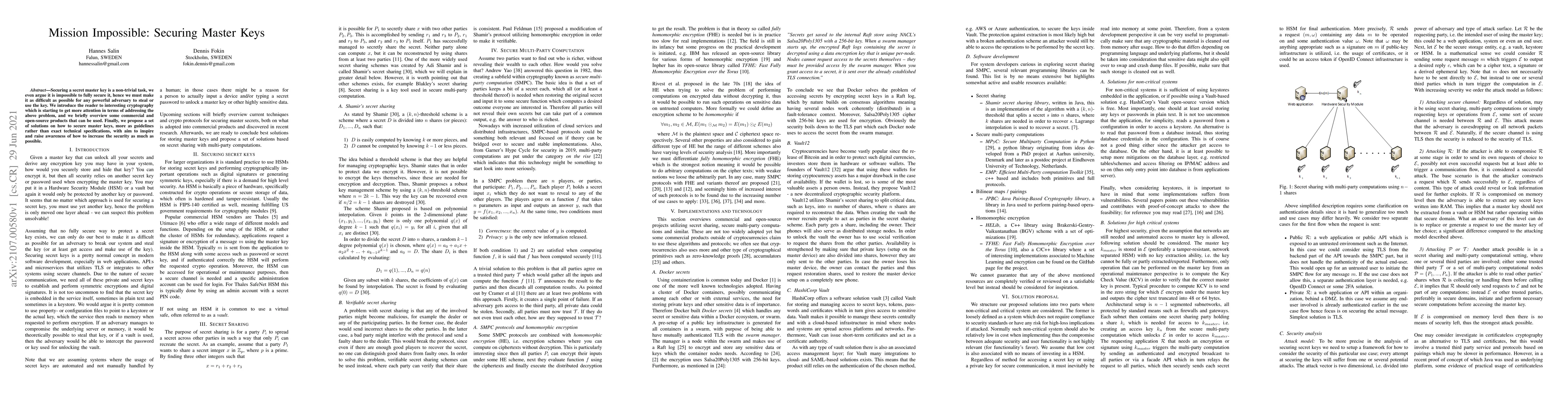This paper discusses the inherent challenges of securing a master key and proposes that while full security is impossible, it can be made extremely difficult for adversaries. It introduces relevant cryptographic techniques and reviews existing products, offering guidelines to enhance master key security.