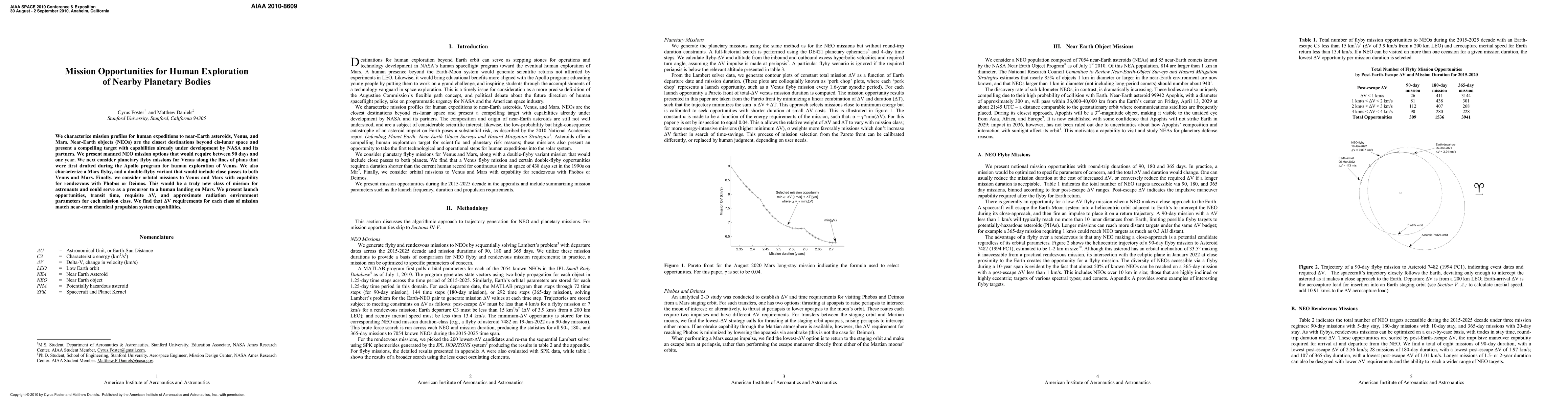 This paper presents mission profiles for human exploration of near-Earth asteroids, Venus, and Mars, highlighting launch opportunities and transit times that match near-term propulsion capabilities.